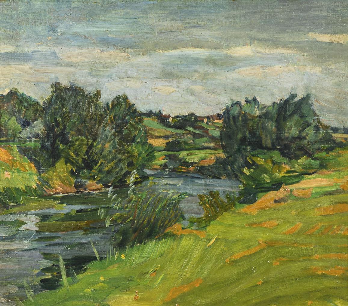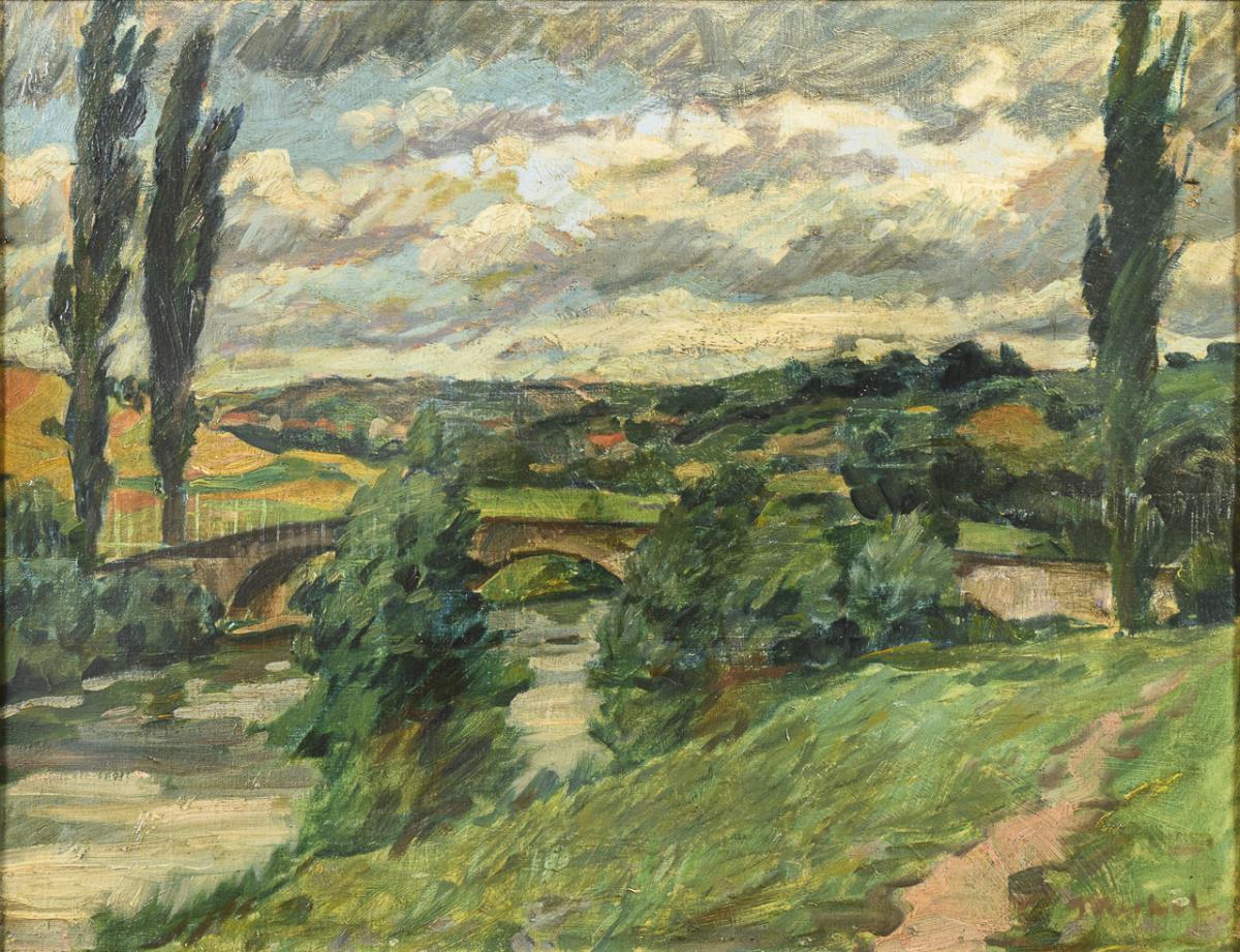 Each oil/canvas. Signed once lower right, artist's stamp verso each and once titled as "Henchlinger Brücke mit Blick auf Untergriesheim".