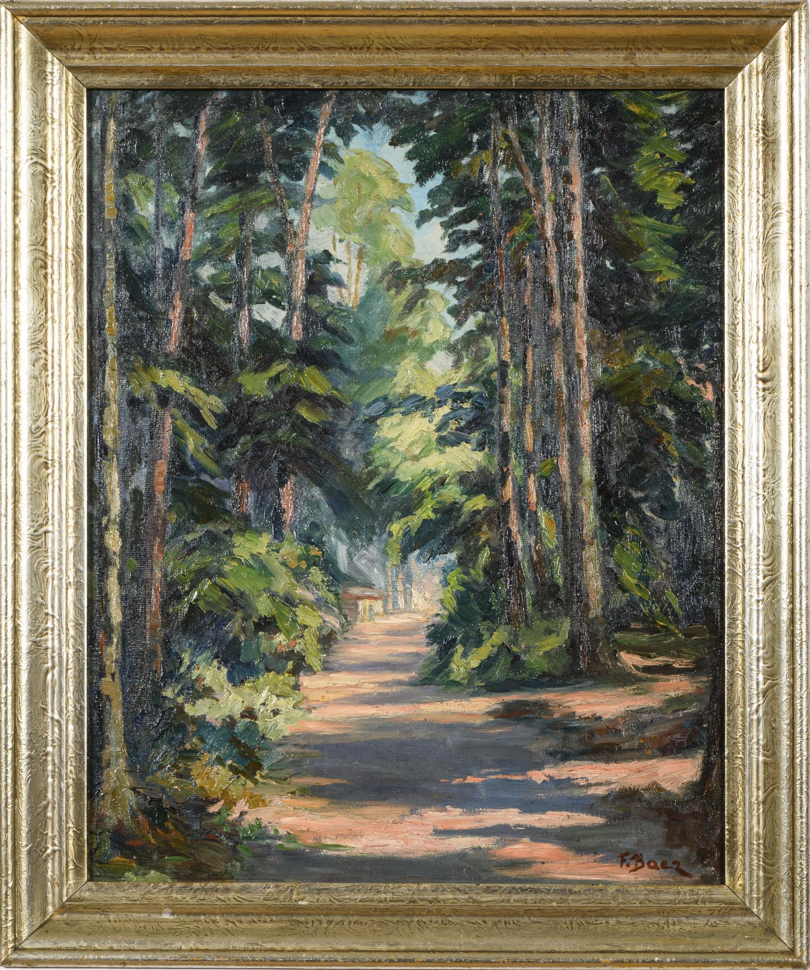 Impressionistically painted forest path between pine trees in bright sunshine. | Addendum 12.02.25: Artist's name Baer, not Baez.