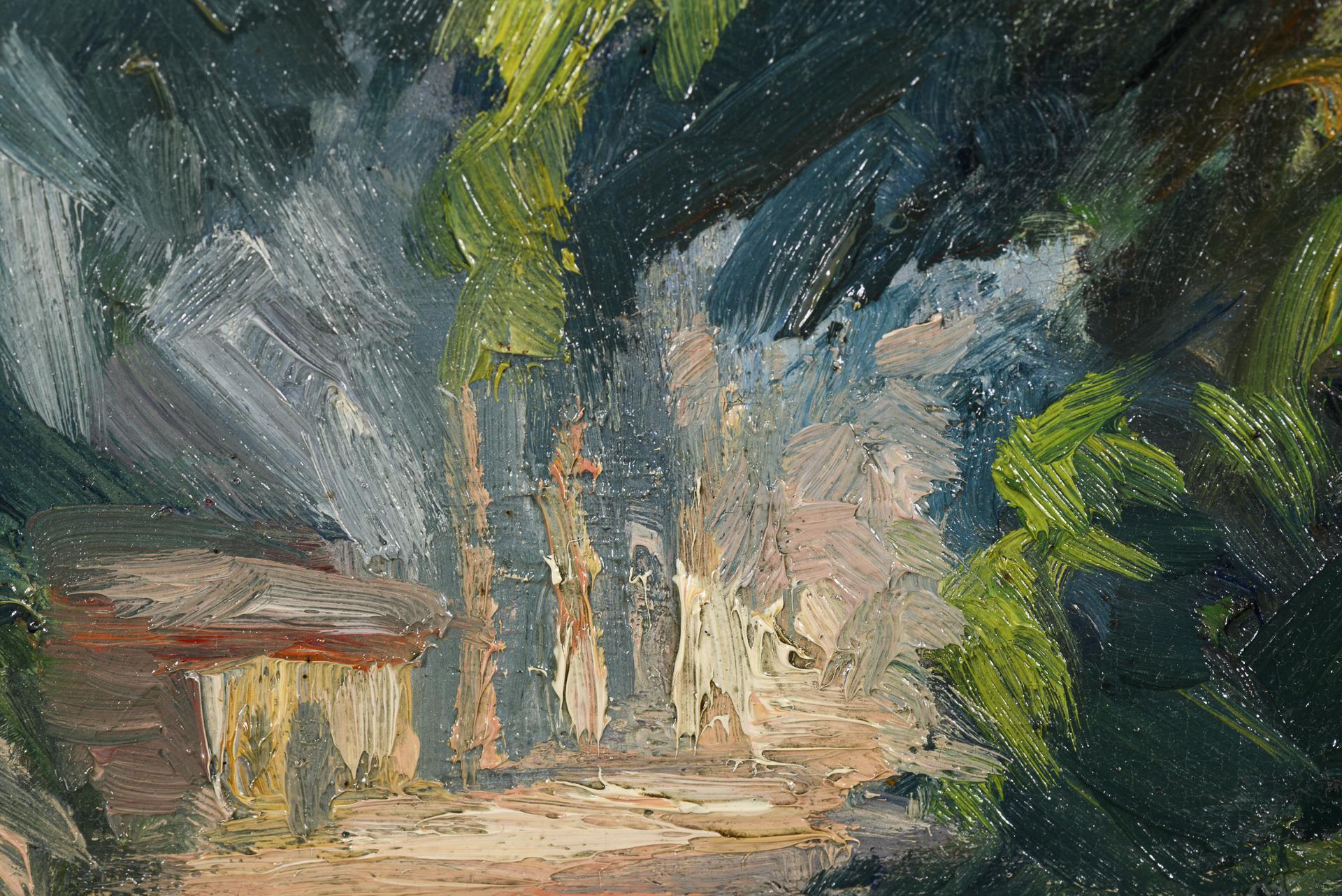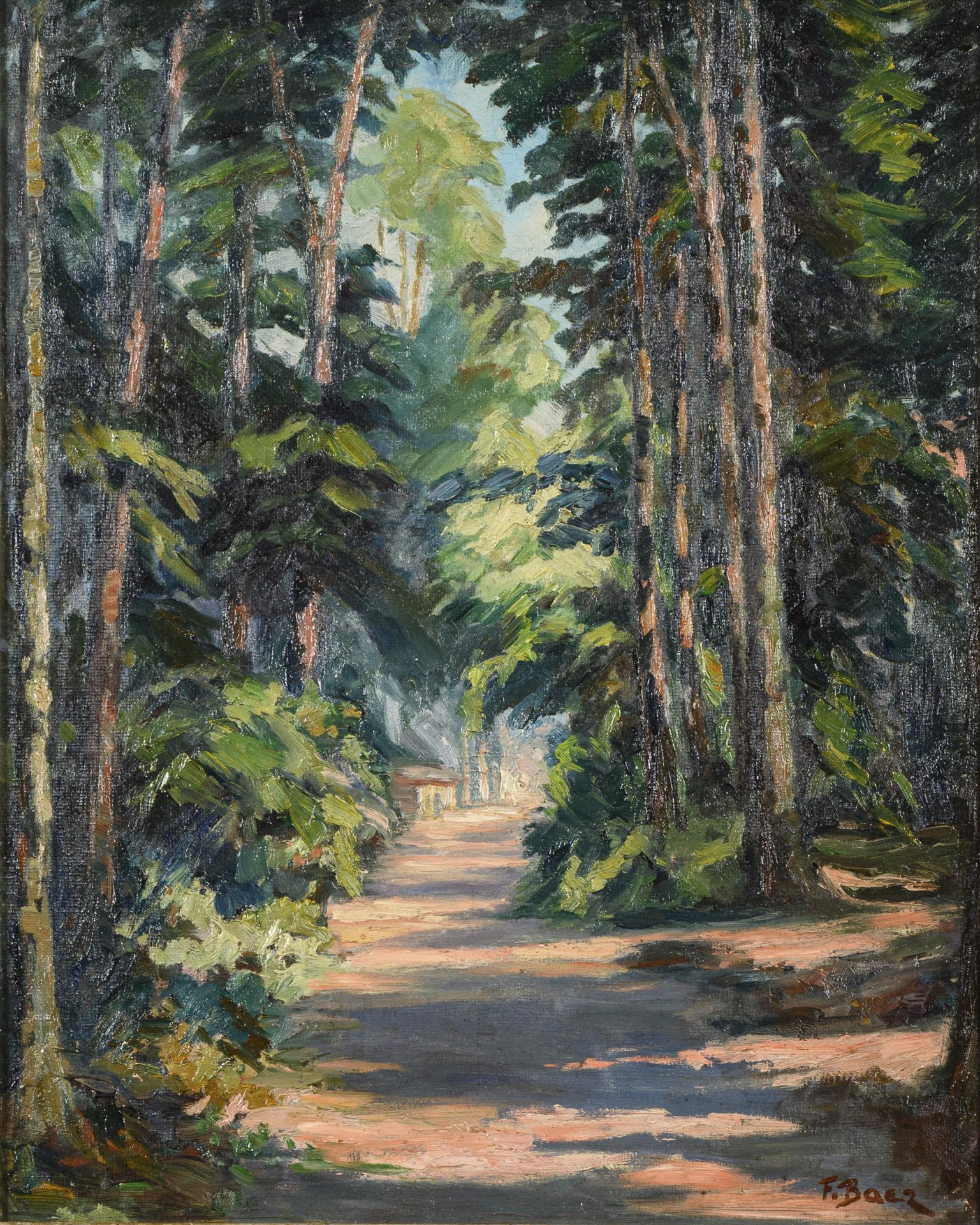 Impressionistically painted forest path between pine trees in bright sunshine. | Addendum 12.02.25: Artist's name Baer, not Baez.