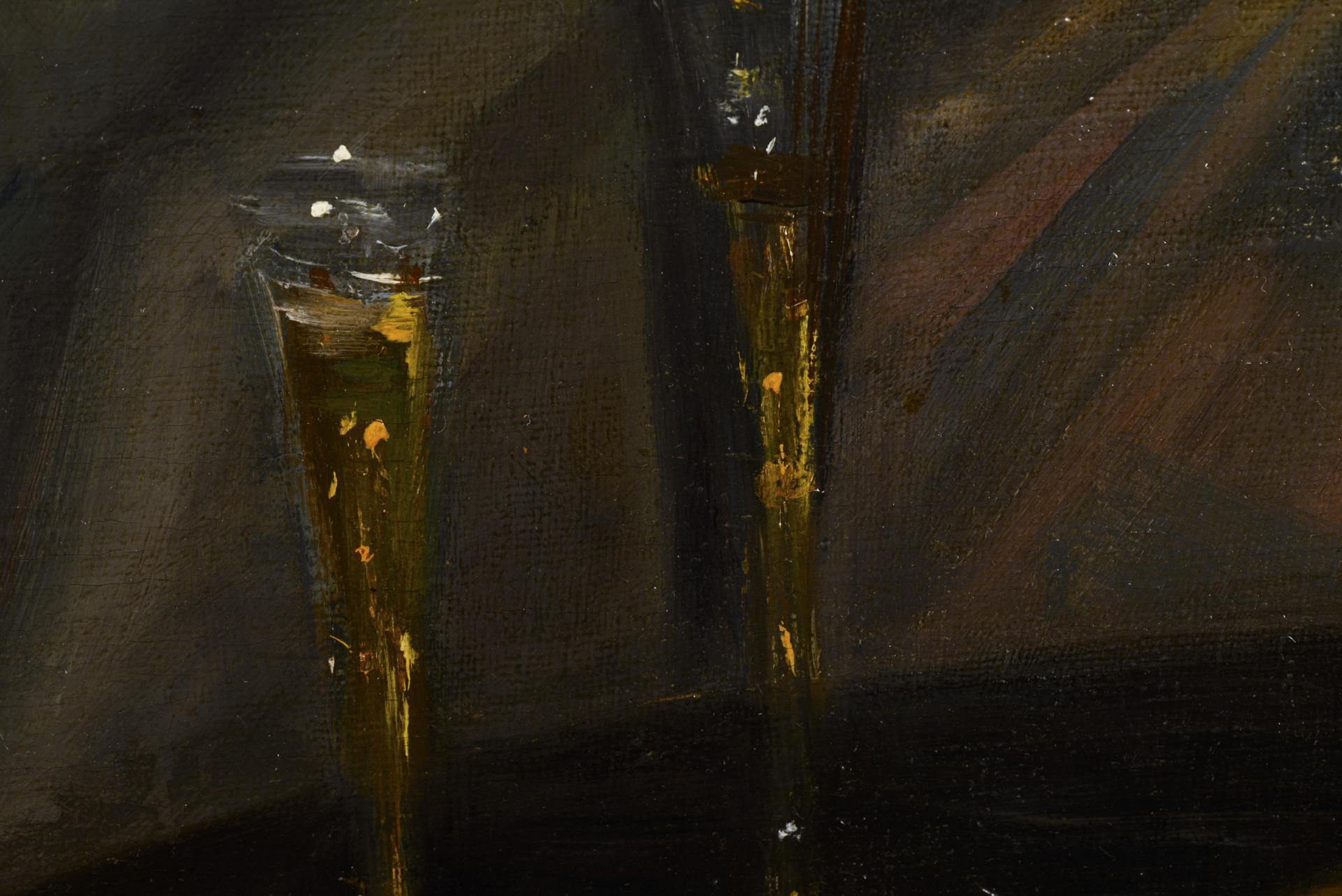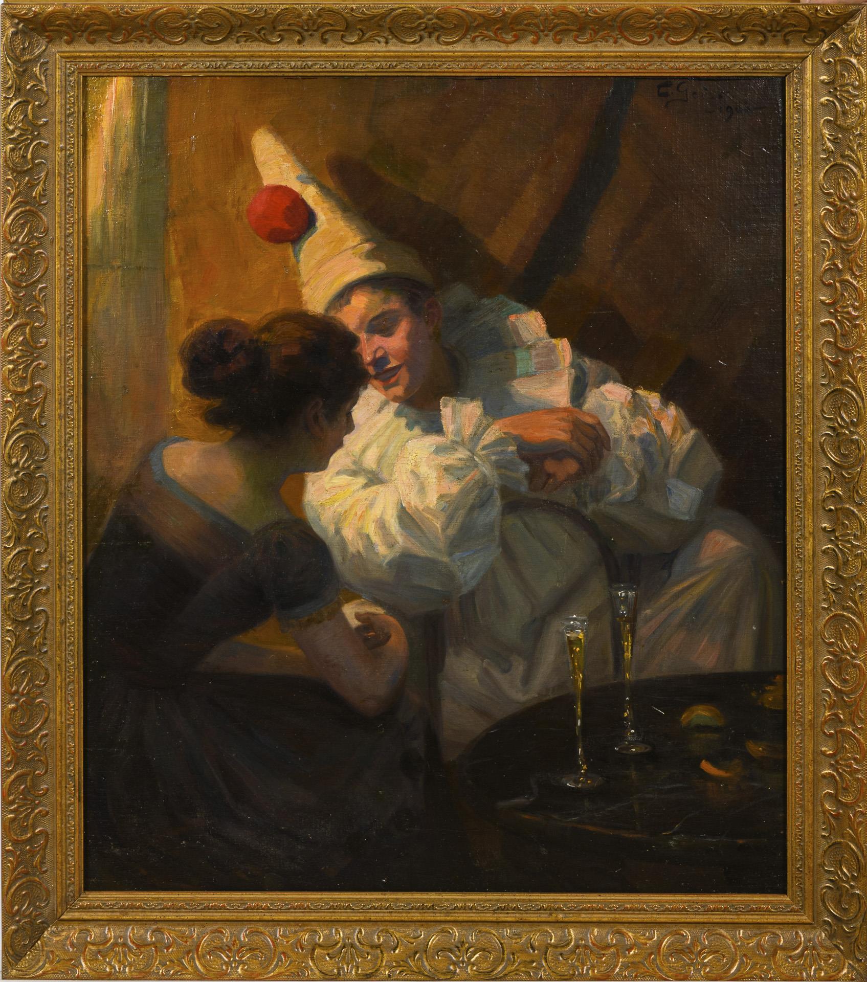 The two figures in atmospheric light with two glasses of champagne in conversation. Slight traces of age.