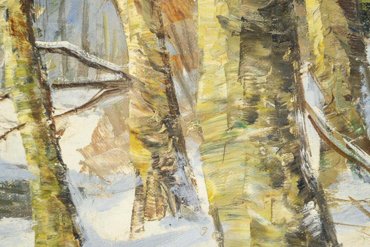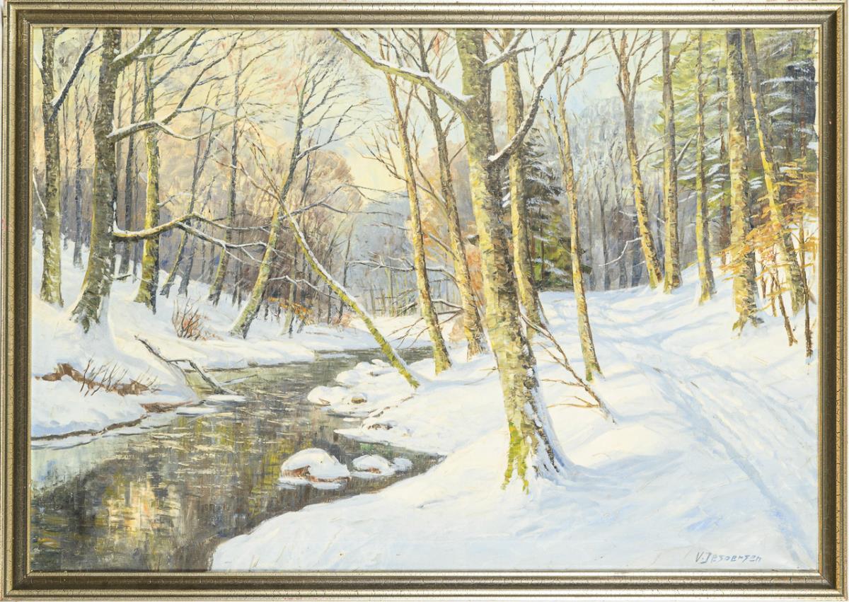 Snowy forest landscape with stream in the evening sun. A small restored area.