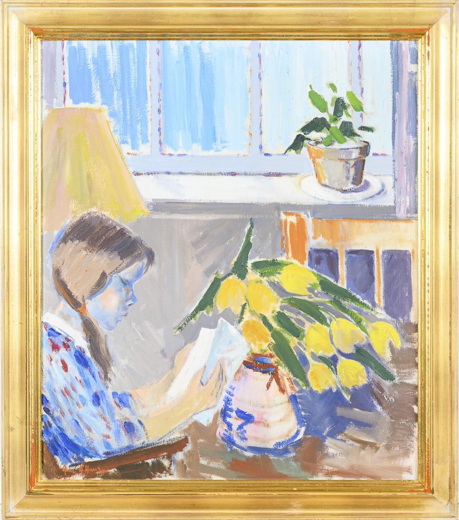 Girl, sitting at a table in the room, reading a book.