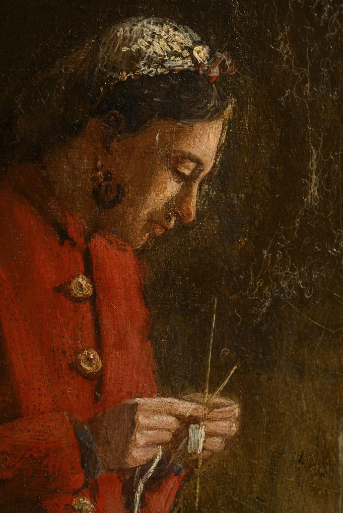 Genre scene with a woman on an armchair doing needlework in the incoming sunlight. In need of cleaning.