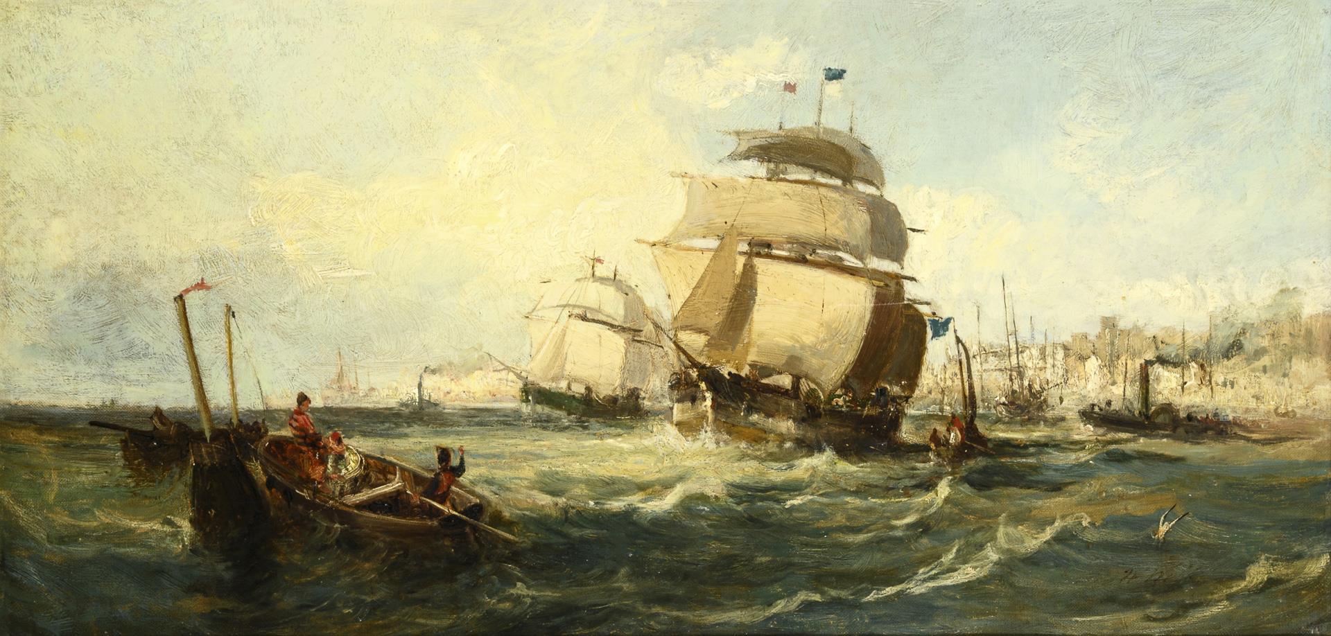 Several ships in front of the coastal city with strong waves. Canvas mounted.