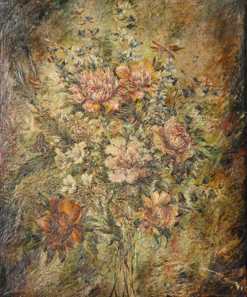 Bouquet with various flowers and plants against a neutral background. In need of cleaning.