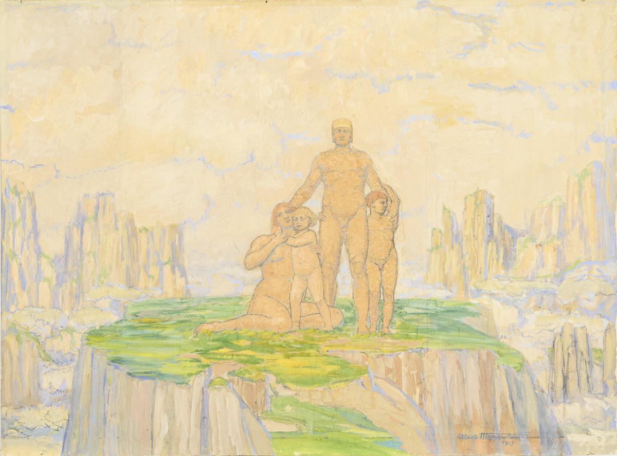 Design for a fresco in the Kammergerichtsgebäude Berlin with a young family in a sunny mountain landscape. Slight nicks to the edges.