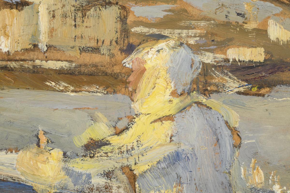 Oil/painting card. Signed lower left, inscribed and artist's stamp verso.