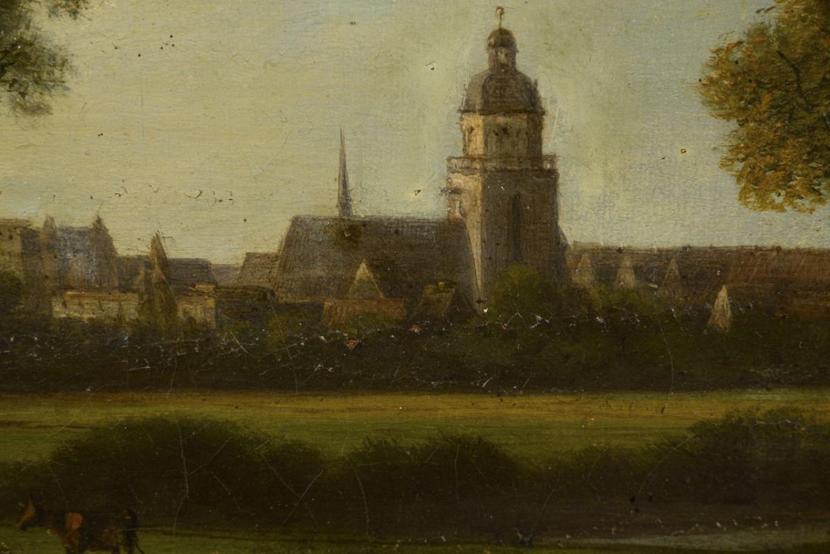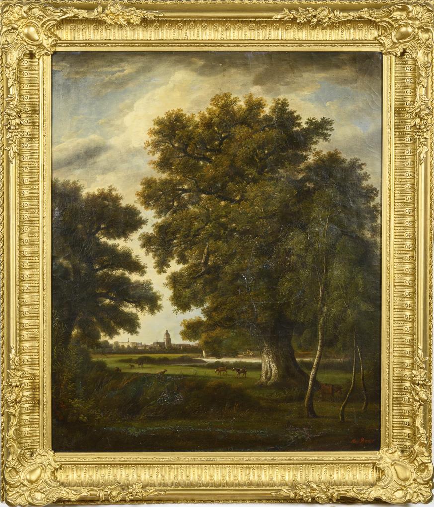 Cattle under oak trees in front of a meadow and a river with a view of Darmstadt. Traces of age.