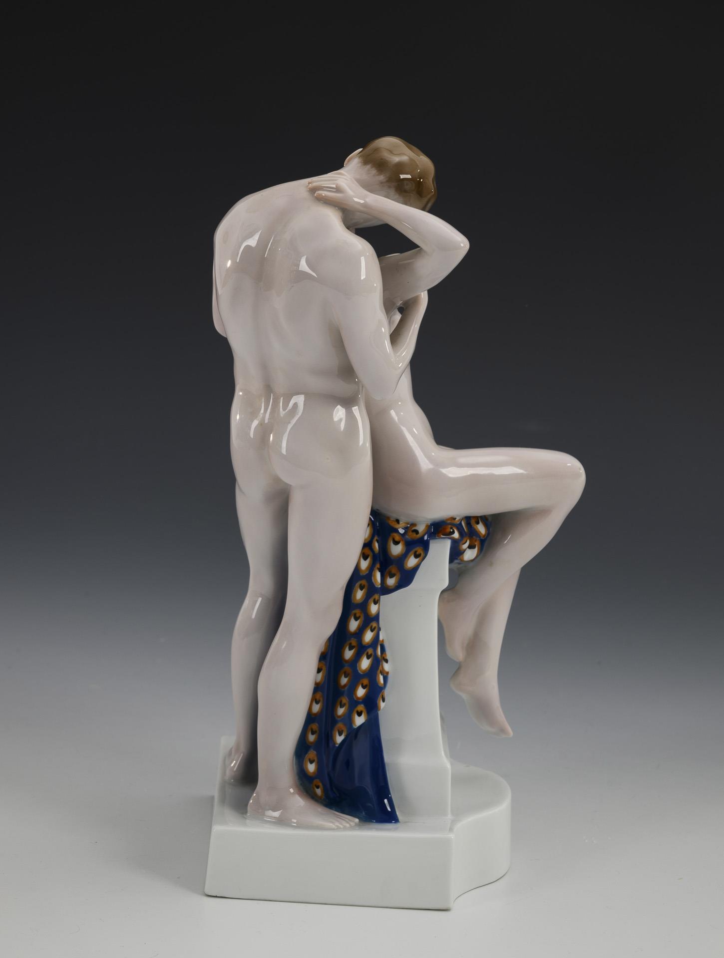 Nude depiction of a woman sitting on a pedestal, kissing the man standing behind her.