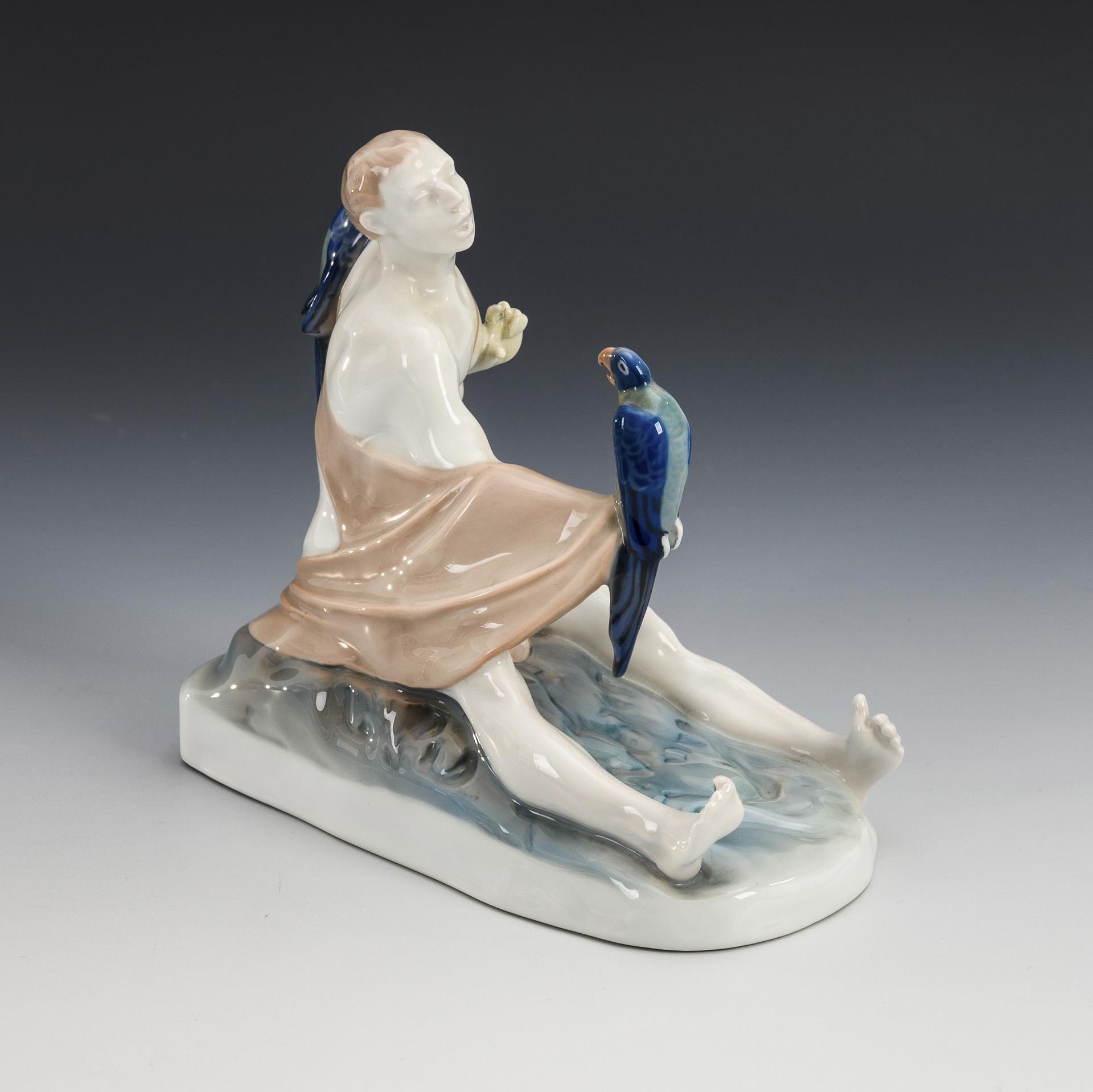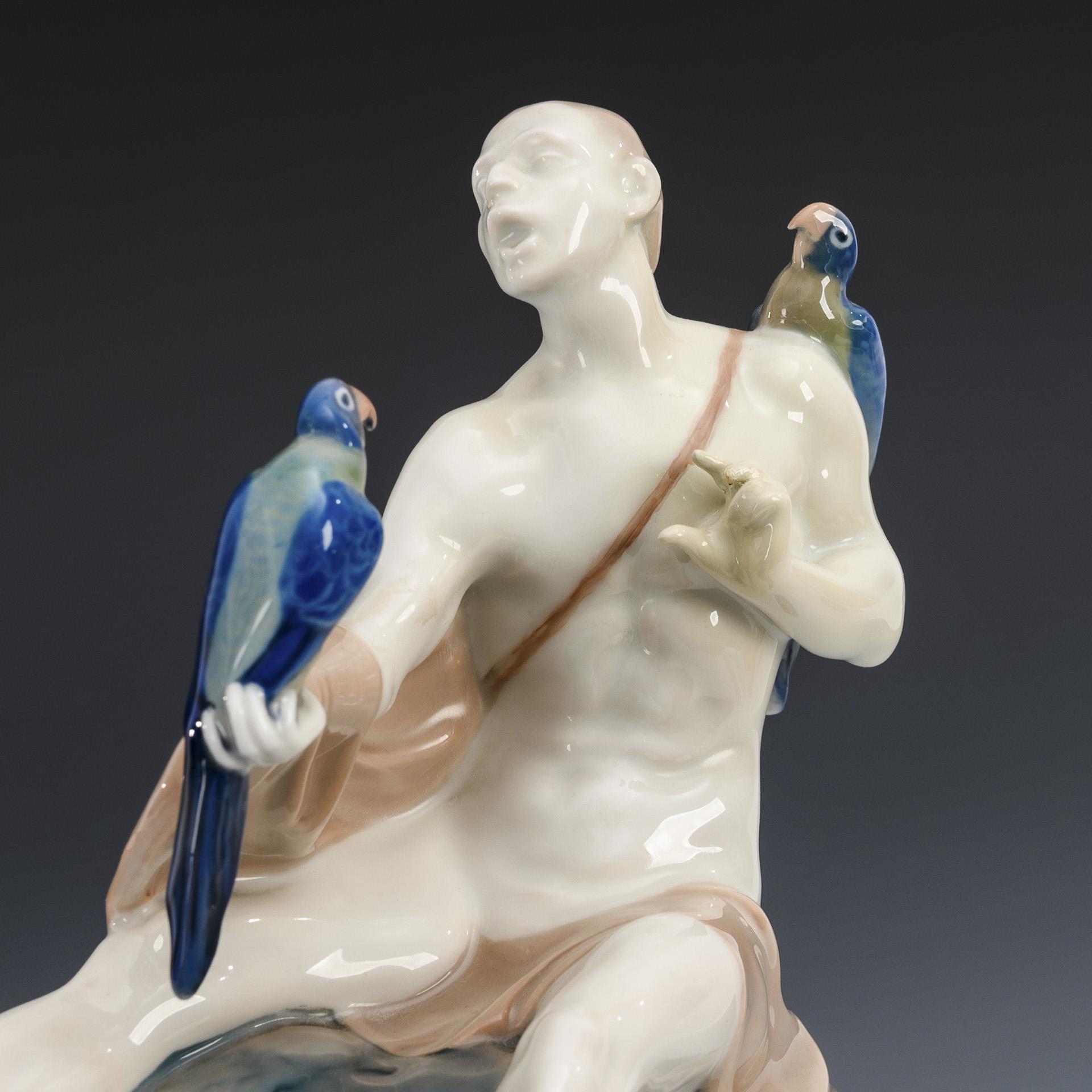 A young man sitting on a wavy base with two parrots. 1 parrot head minimally restored.