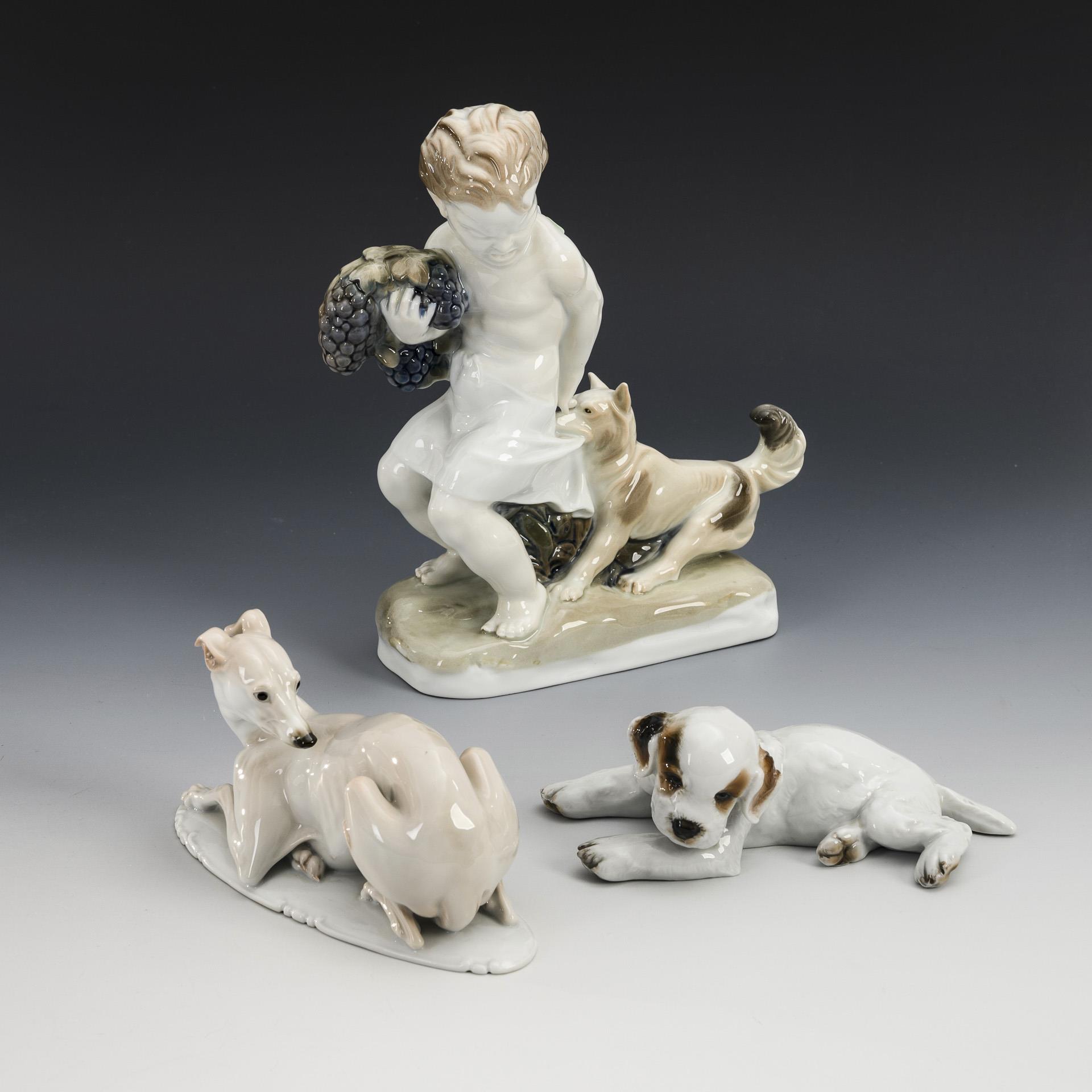 1x model no. K 538, "Erwischt", design 1919 by Ferdinand Liebermann (1883-1941): Cupid with grapes being held by a dog by the loincloth (h 22.5 cm). / 1x model no. 80, design by Theodor Kärner (1884-1966): lying greyhound (h 8.5 cm, l 16.5 cm). / 1x model no. 1122, design by Theodor Kärner: lying puppy (H 5.5 cm, L 15.5 cm).