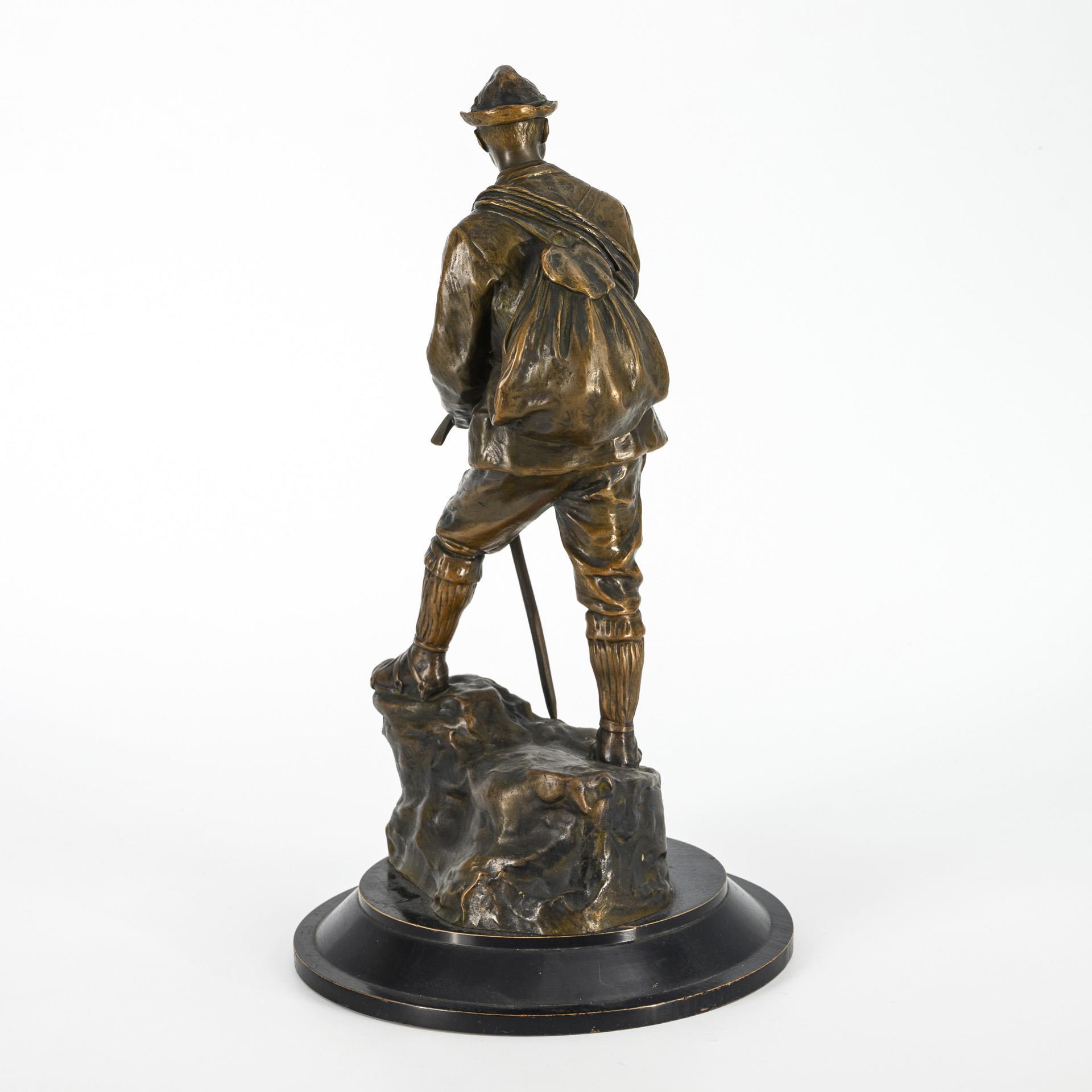 Fully sculpted figure of the man leaning on the ice axe while the rope is thrown over his shoulder. Bronze partly "verdigris" attached, minimal hairline crack on the wood at the back.