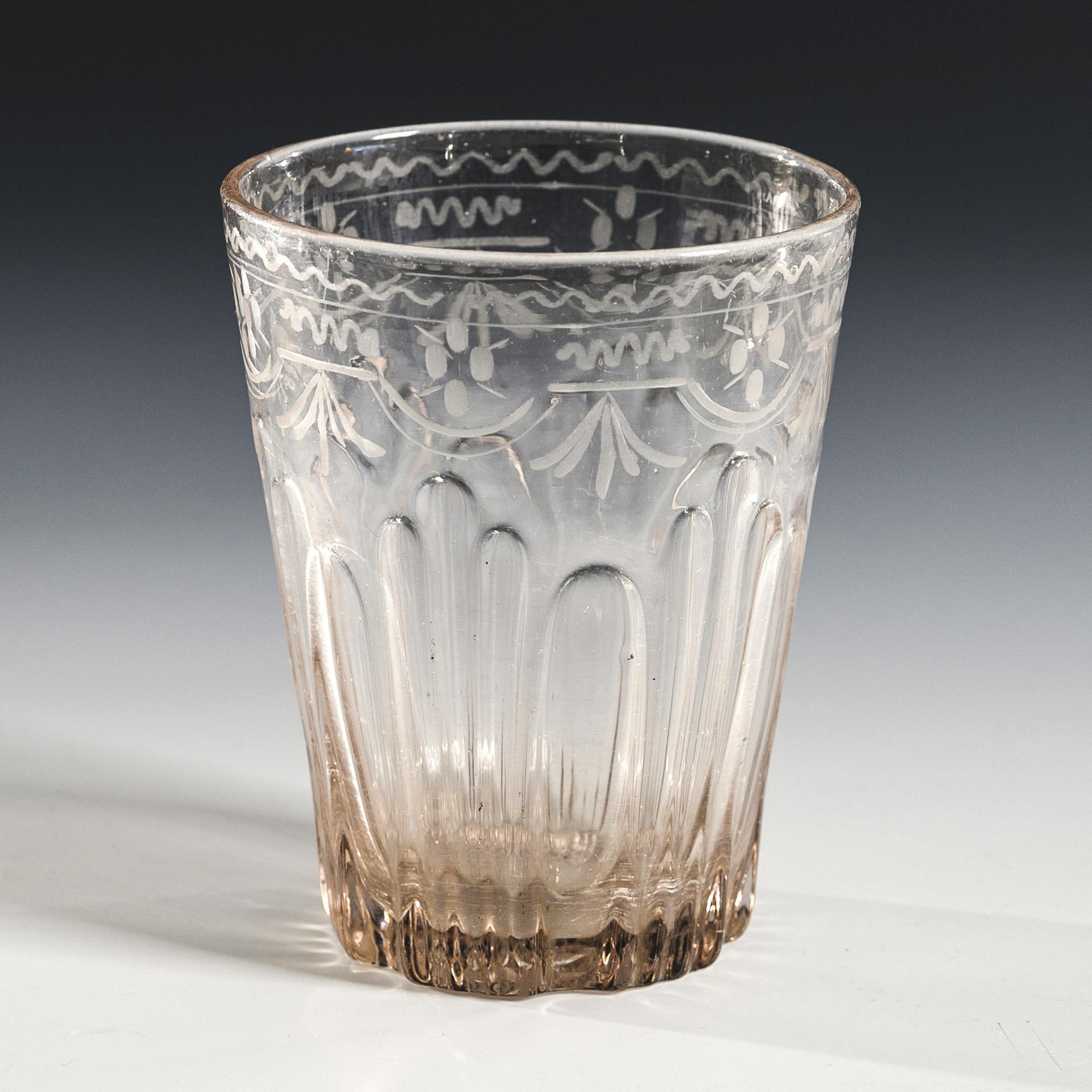 Conical beaker with an optical ribbed pattern and a vegetal engraved border; pontil mark.