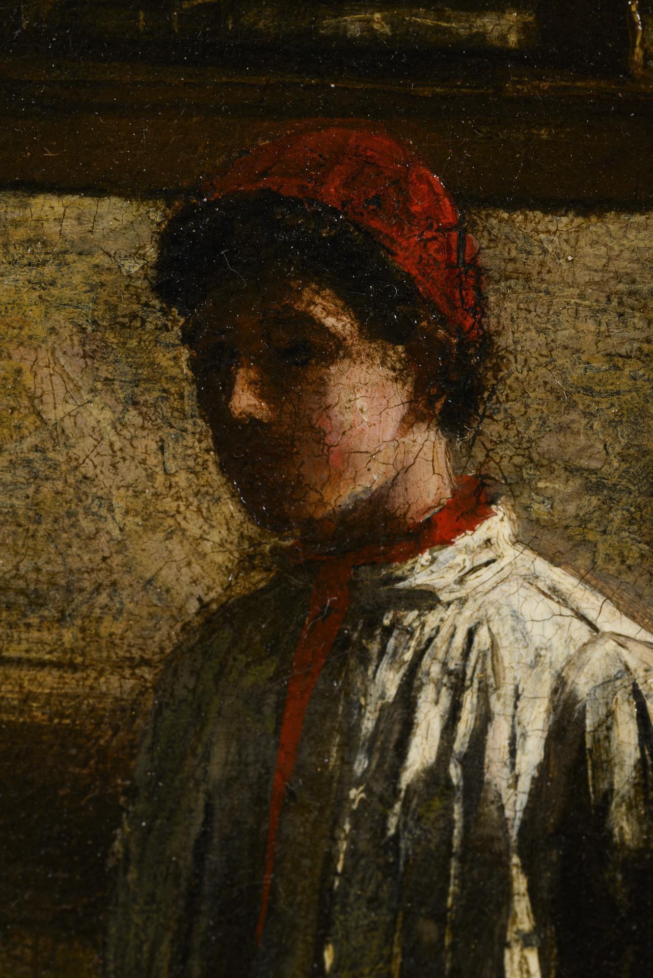 Baroque church interior with the altar boy between the columns. Canvas wax-doubled.