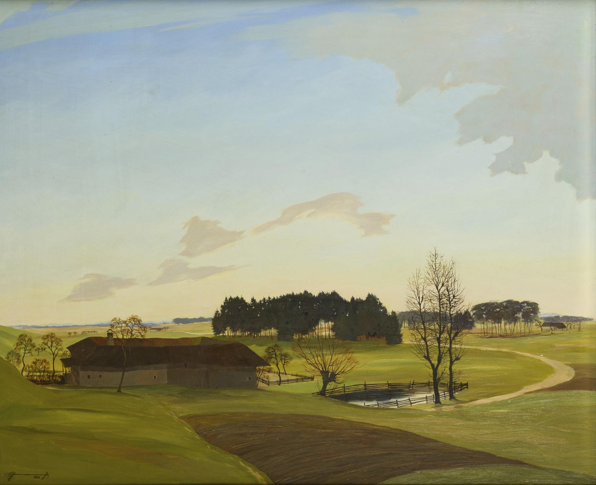 Landscape panorama painted in the style of New Objectivity with a large farm in a wide plain under a slightly overcast sky.