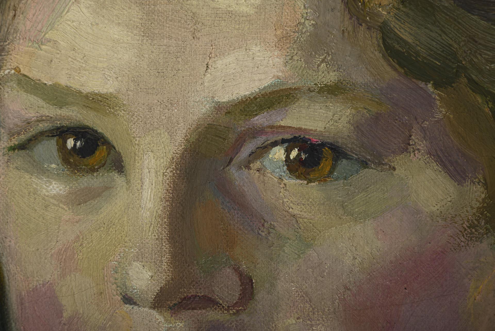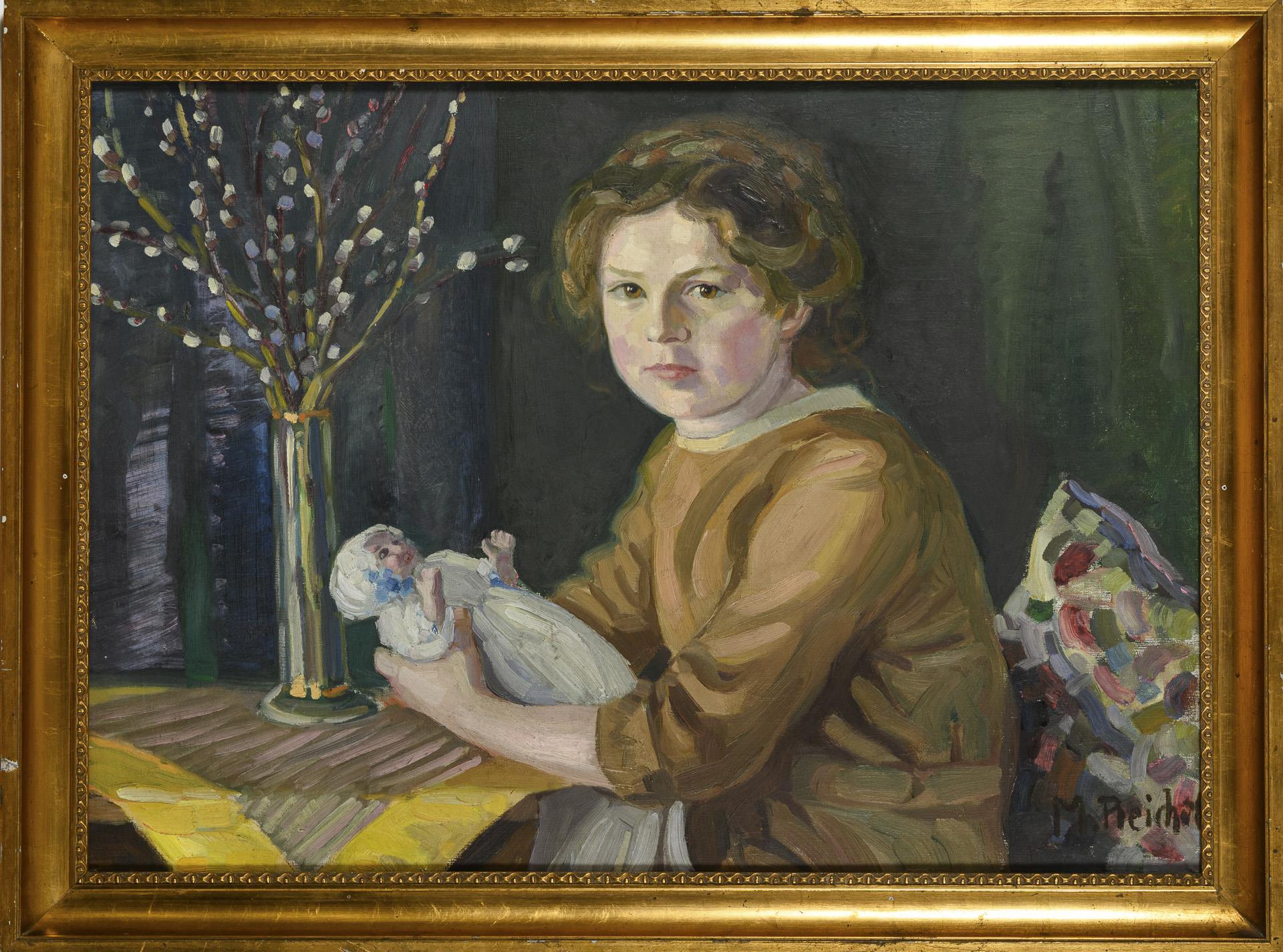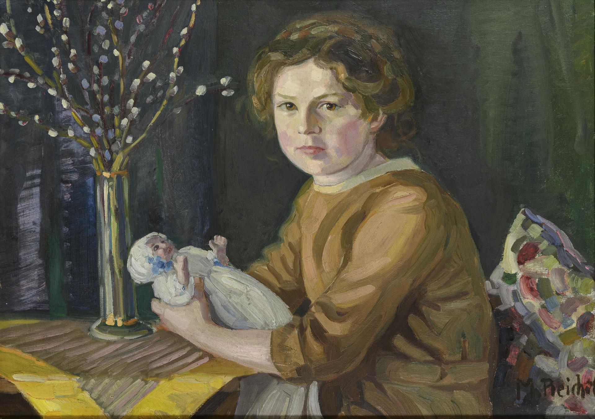 Portrait of the girl, who was probably a daughter of the artist, at a table with a doll next to a bouquet of willow catkins.