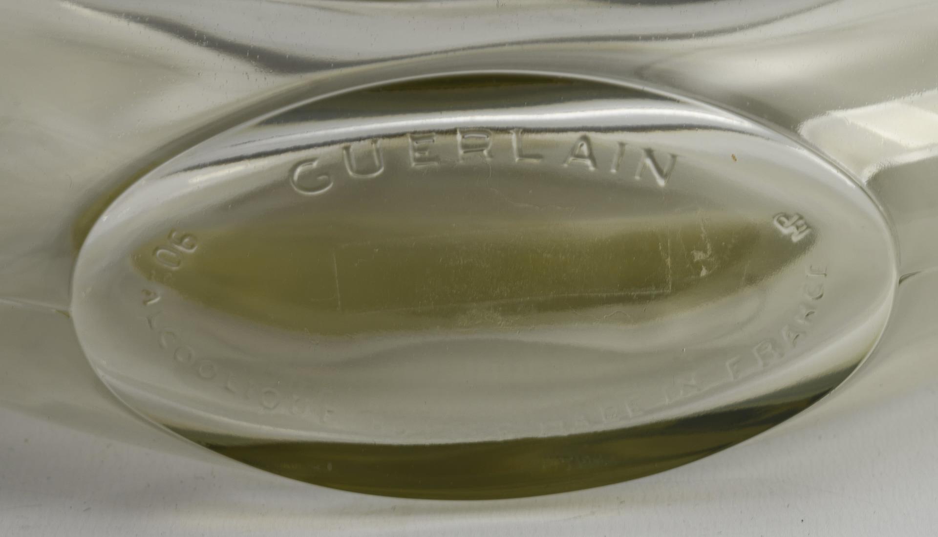 "Shalimar" perfume produced from 1925 with faceted walls and blue stopper / "Chamade" in inverted heart shape / Flacon marked "Parure" with opaque base and wavy stopper / Large bottle with label "eau de toilette shalimar". / Large flat round bottle labeled "Chamade, eau de cologne".