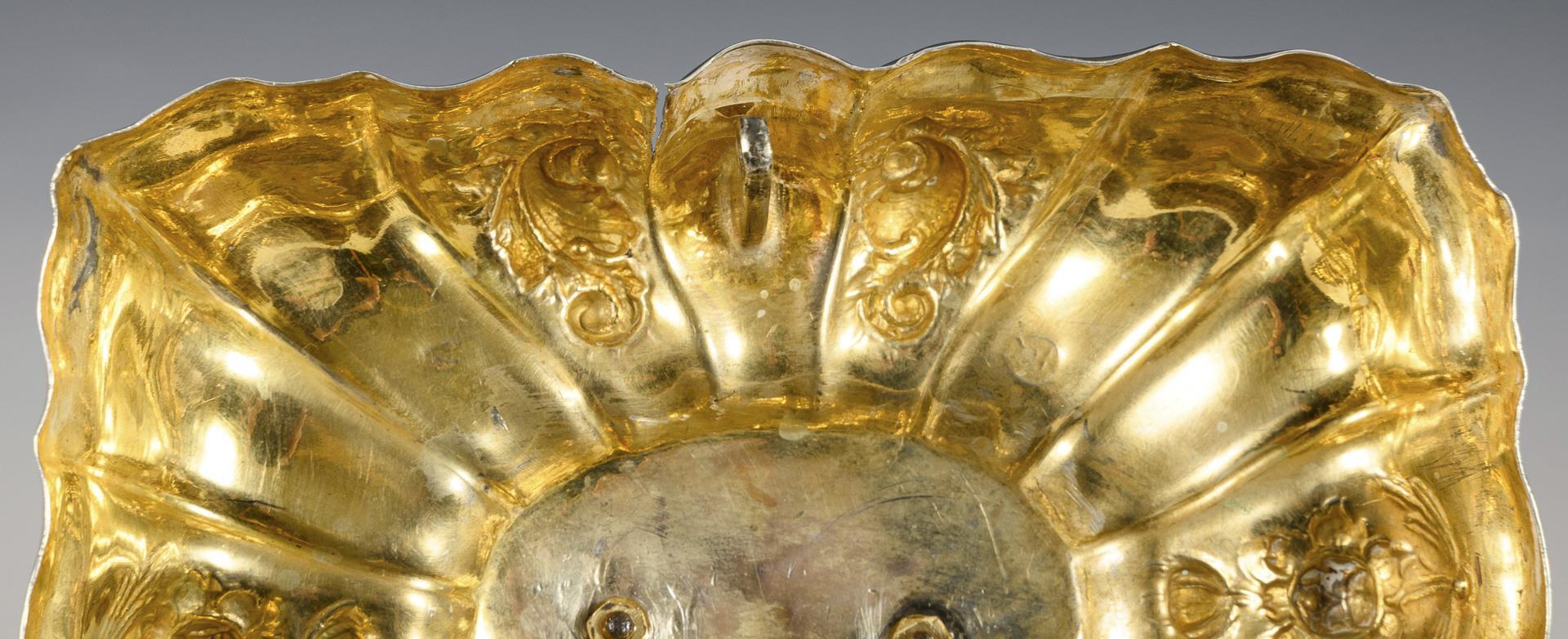 Lockable, gilded sugar bowl with rose reliefs. 1 key. Crack in the lid, solder spots.
