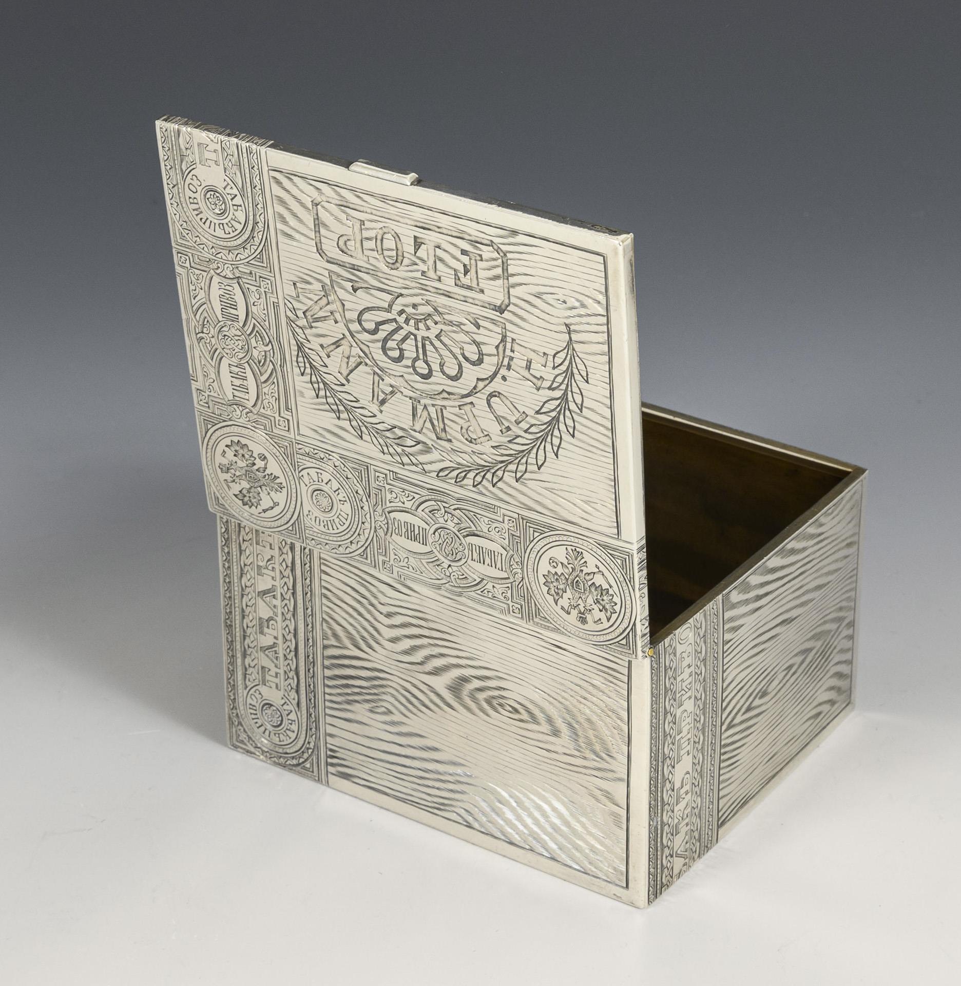 Silver box with Cyrillic inscription and wooden structure. Some scratches and small dents.