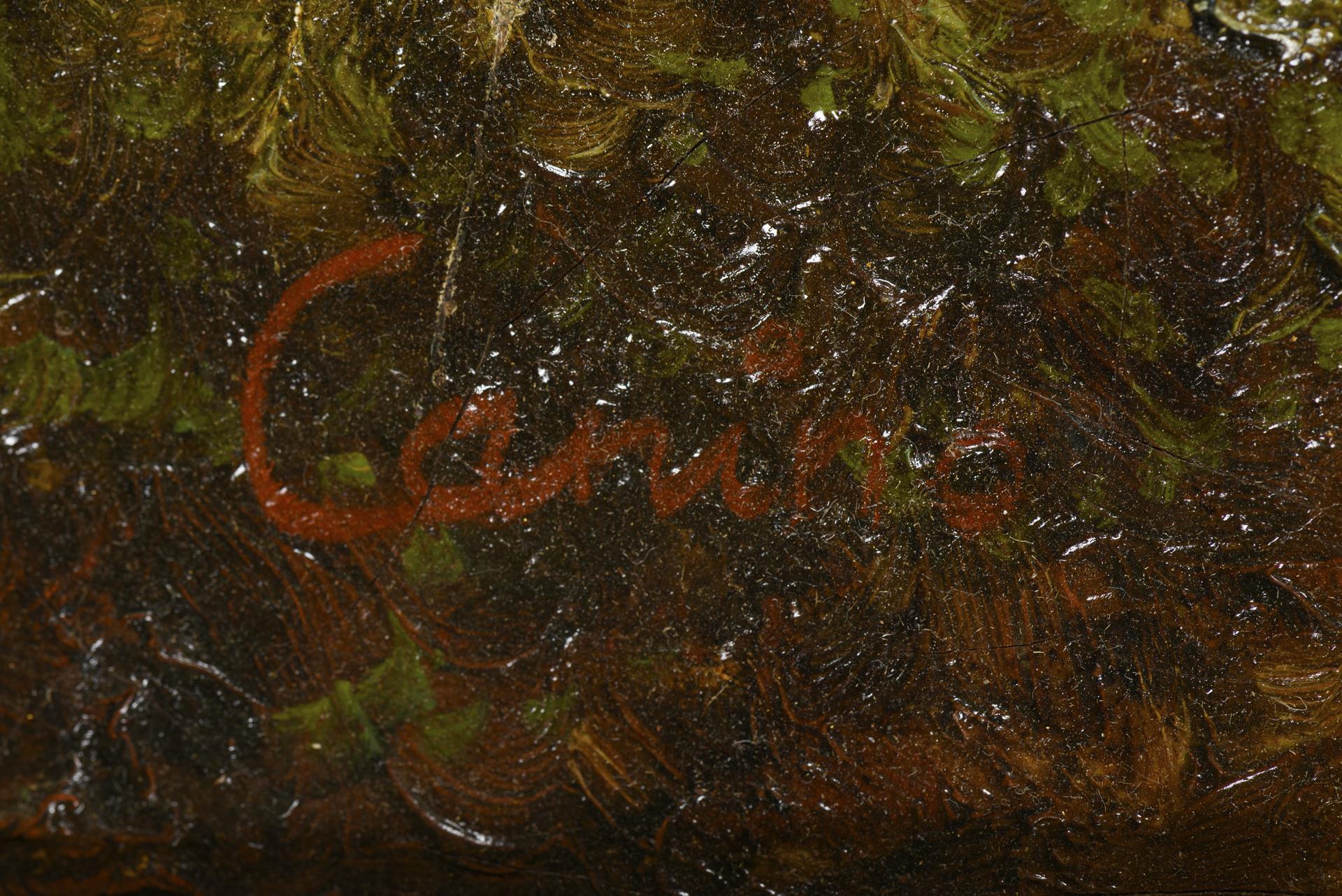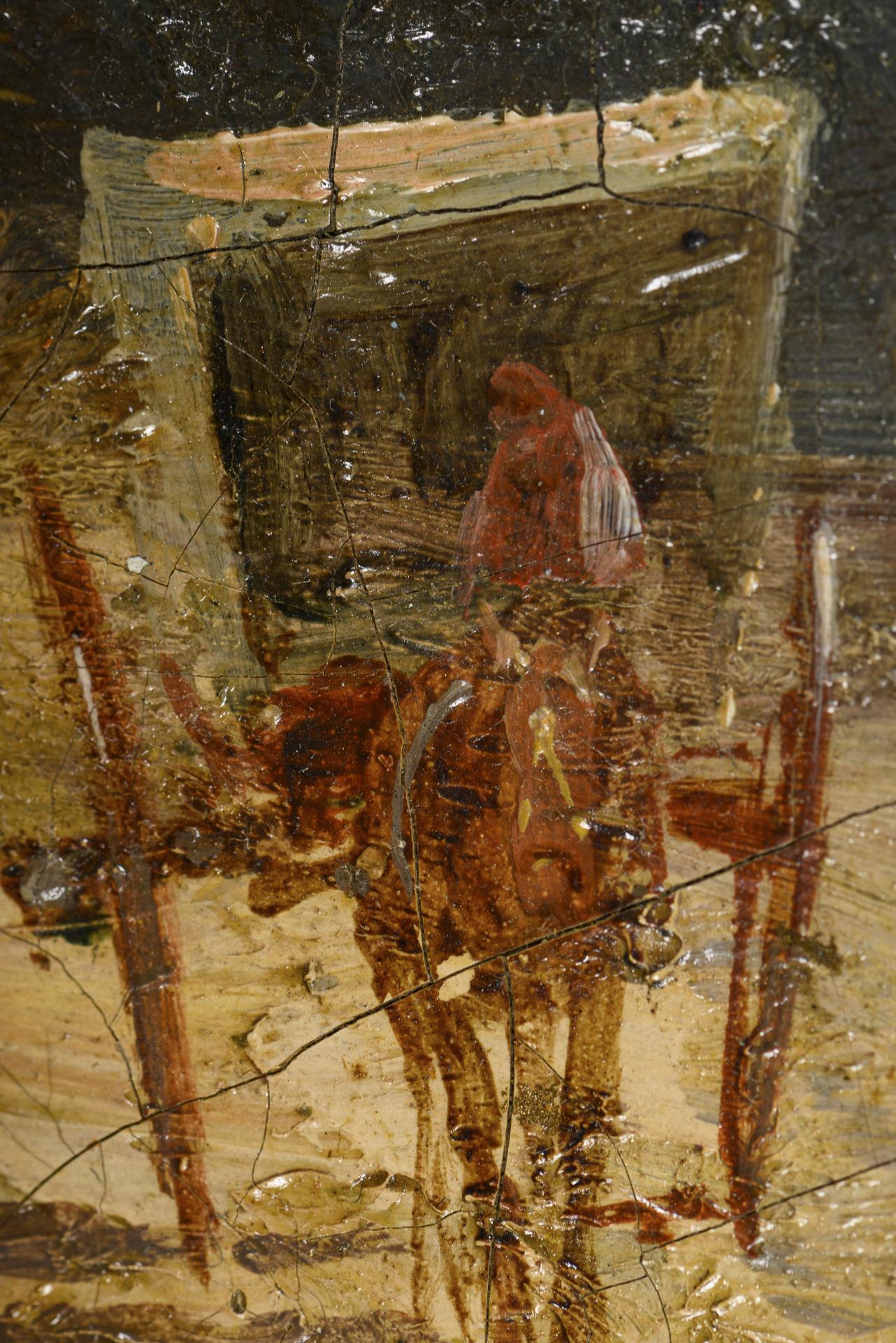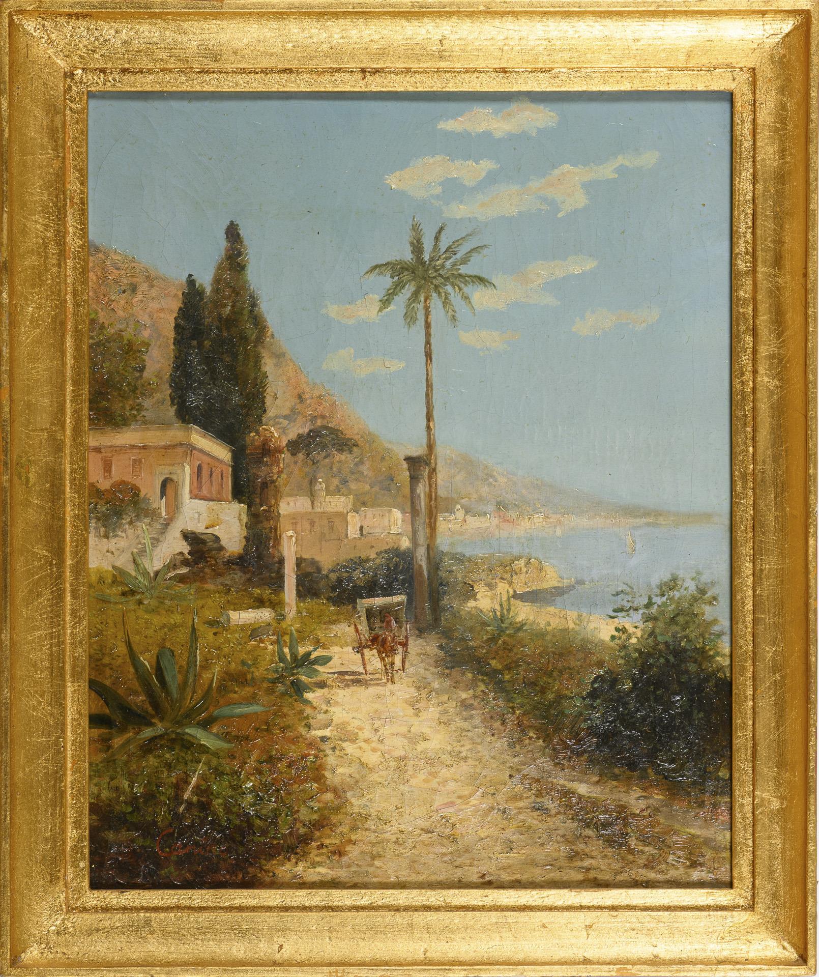 Mediterranean landscape with a horseman in the sunshine above the sea. One restored area with backing.