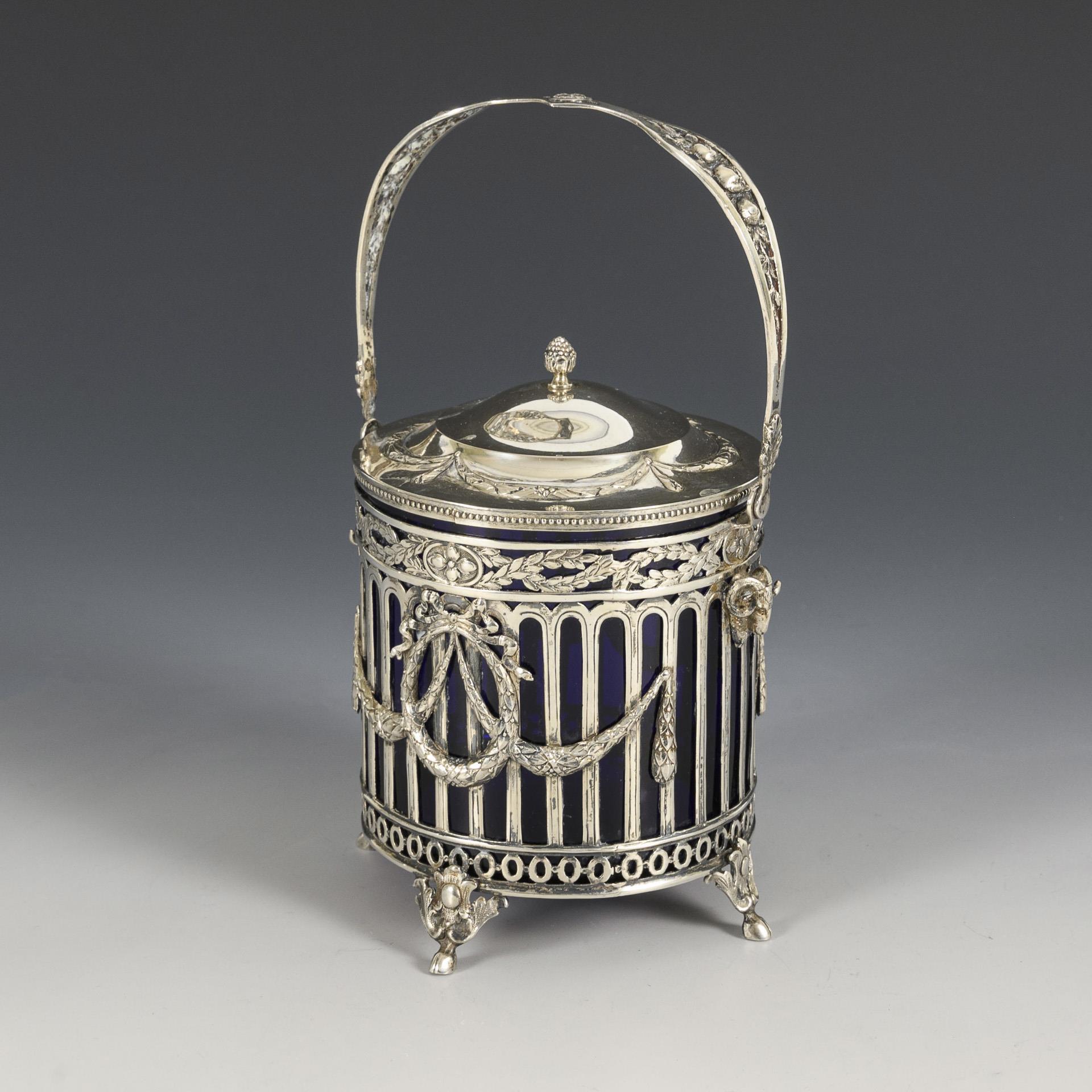 Glass, silver. H 14.5 cm, Ø 12.5 cm, height with handle 20.5 cm. Total weight 516 g.