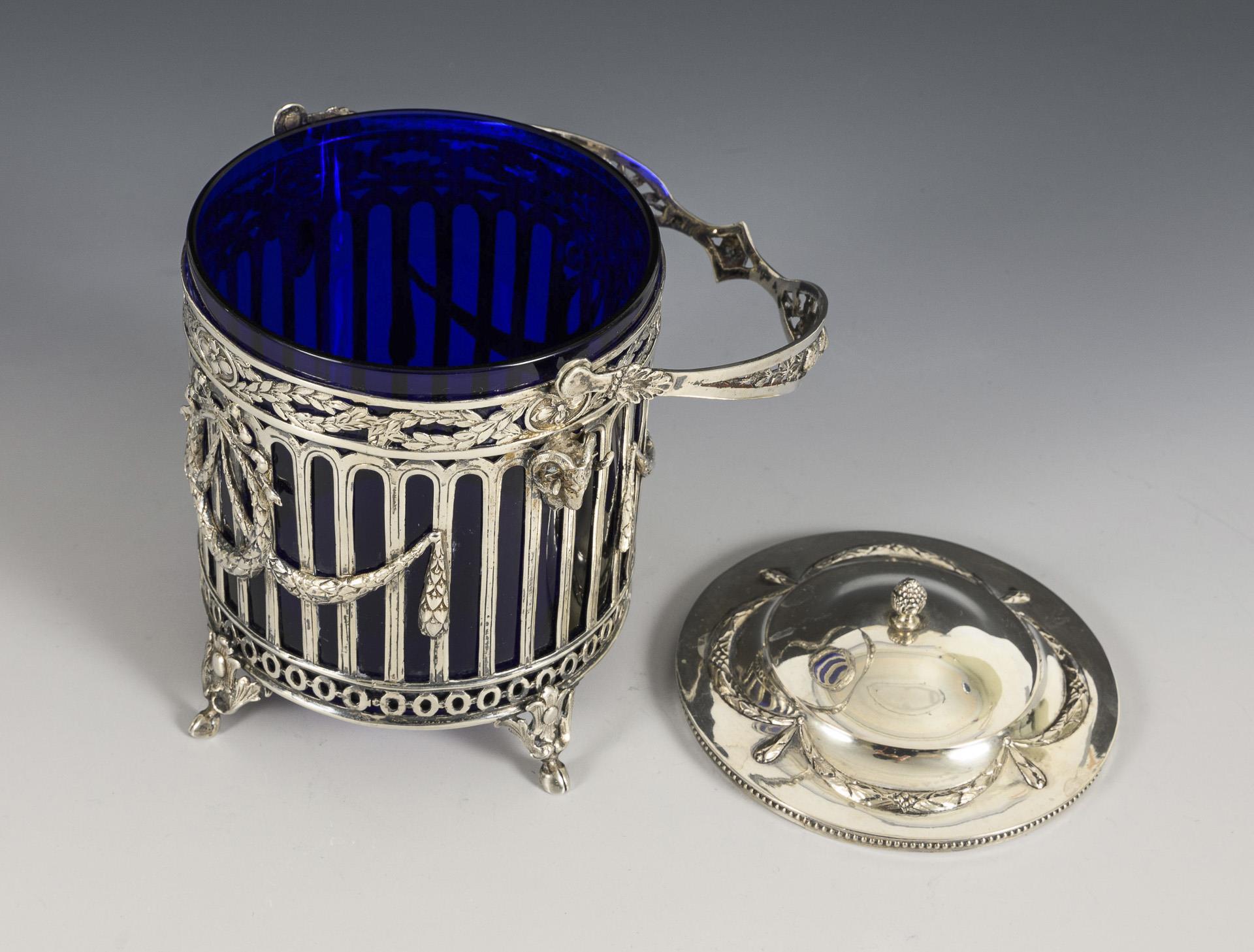 Round handle box with cobalt glass insert. Ferdinand C. Henzler, Hanau.