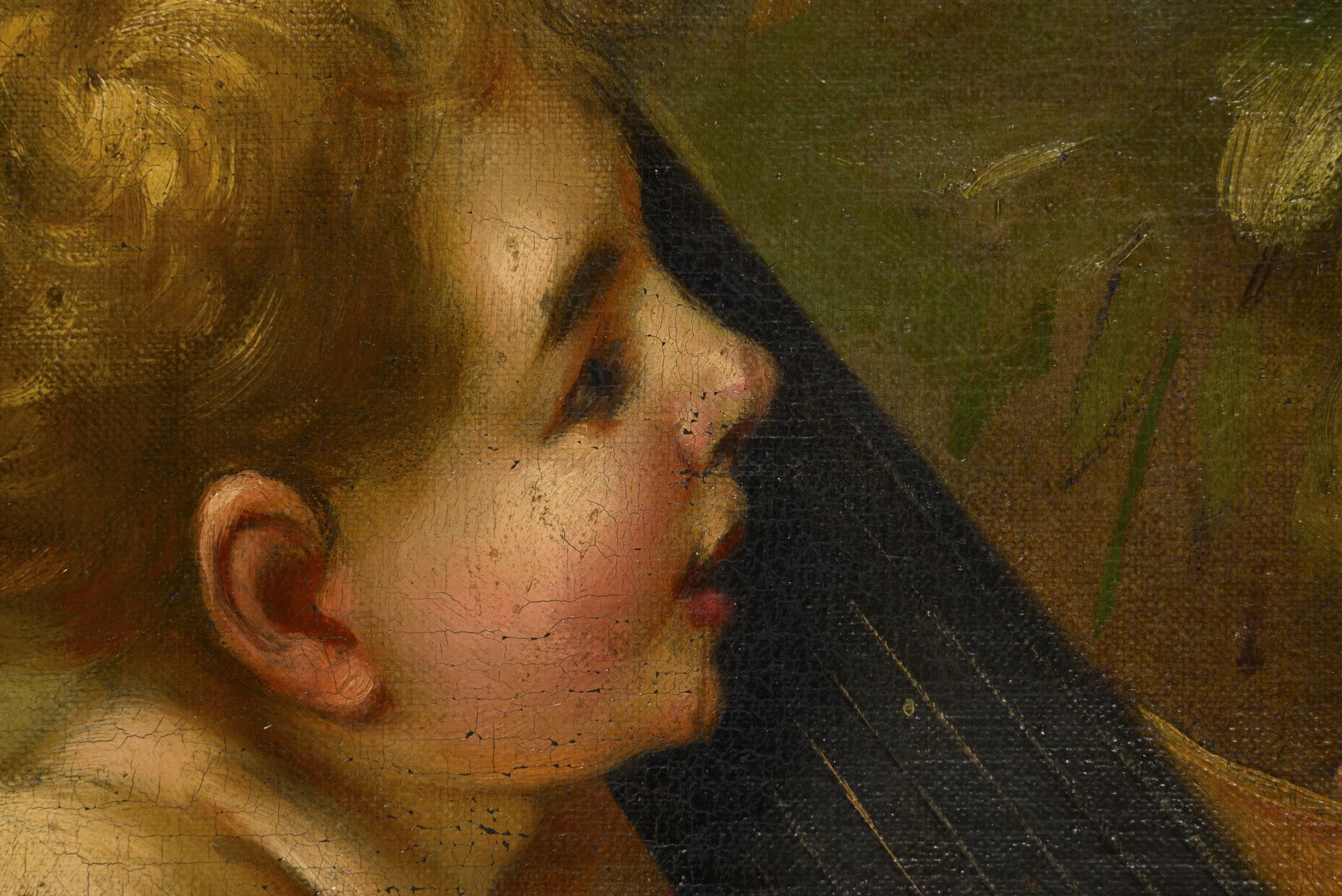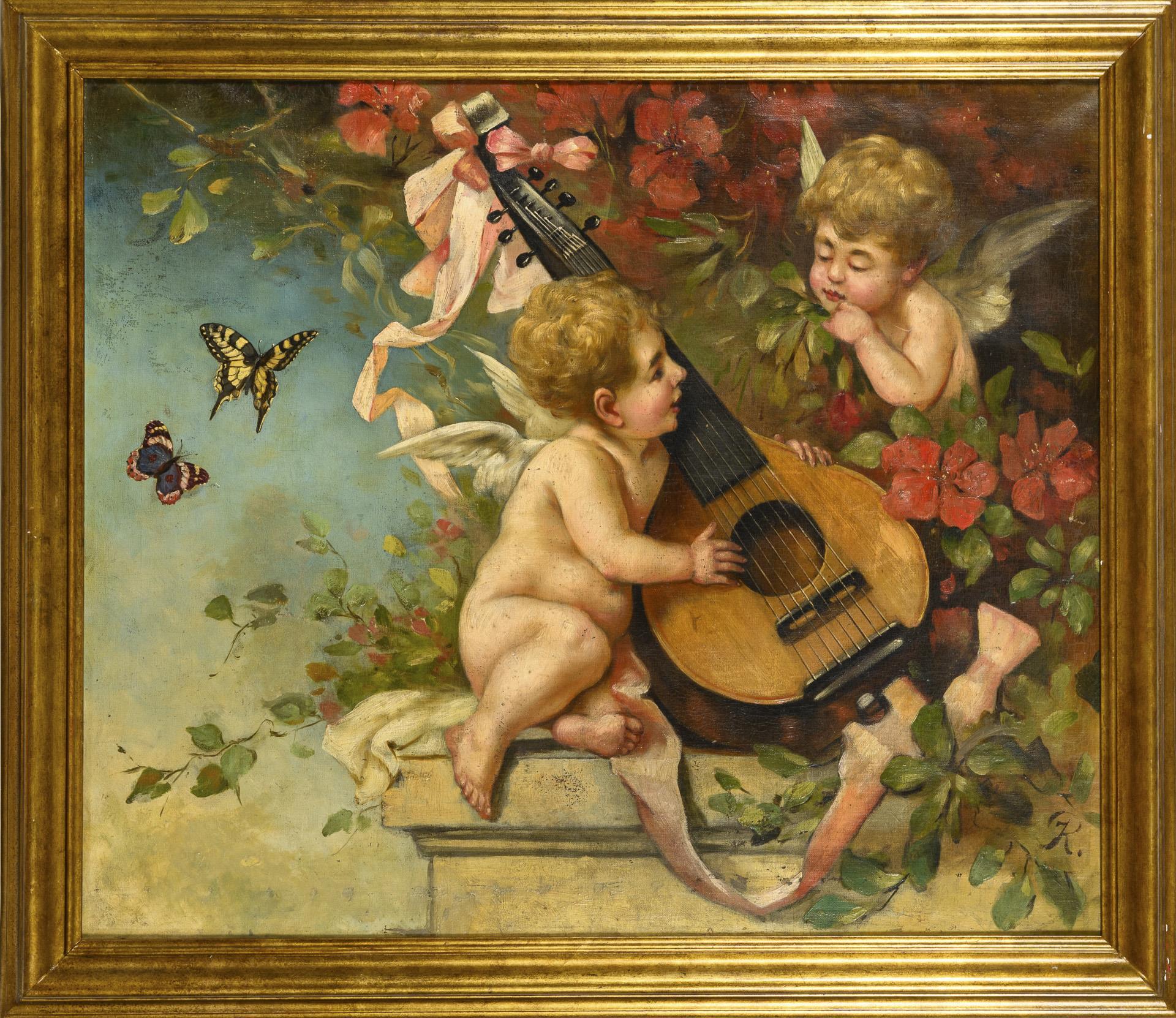 Large, decorative painting with the two winged children at the instrument, surrounded by flowers and butterflies. Traces of age.