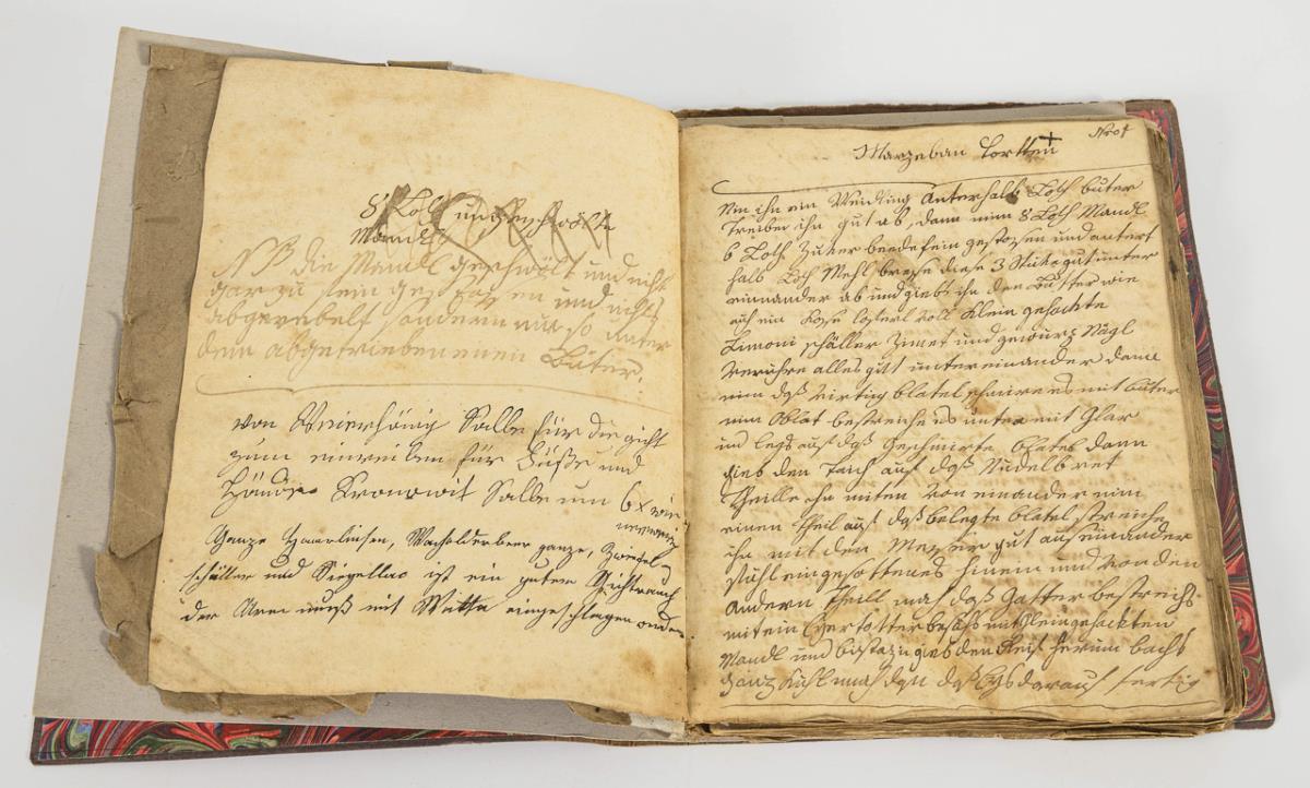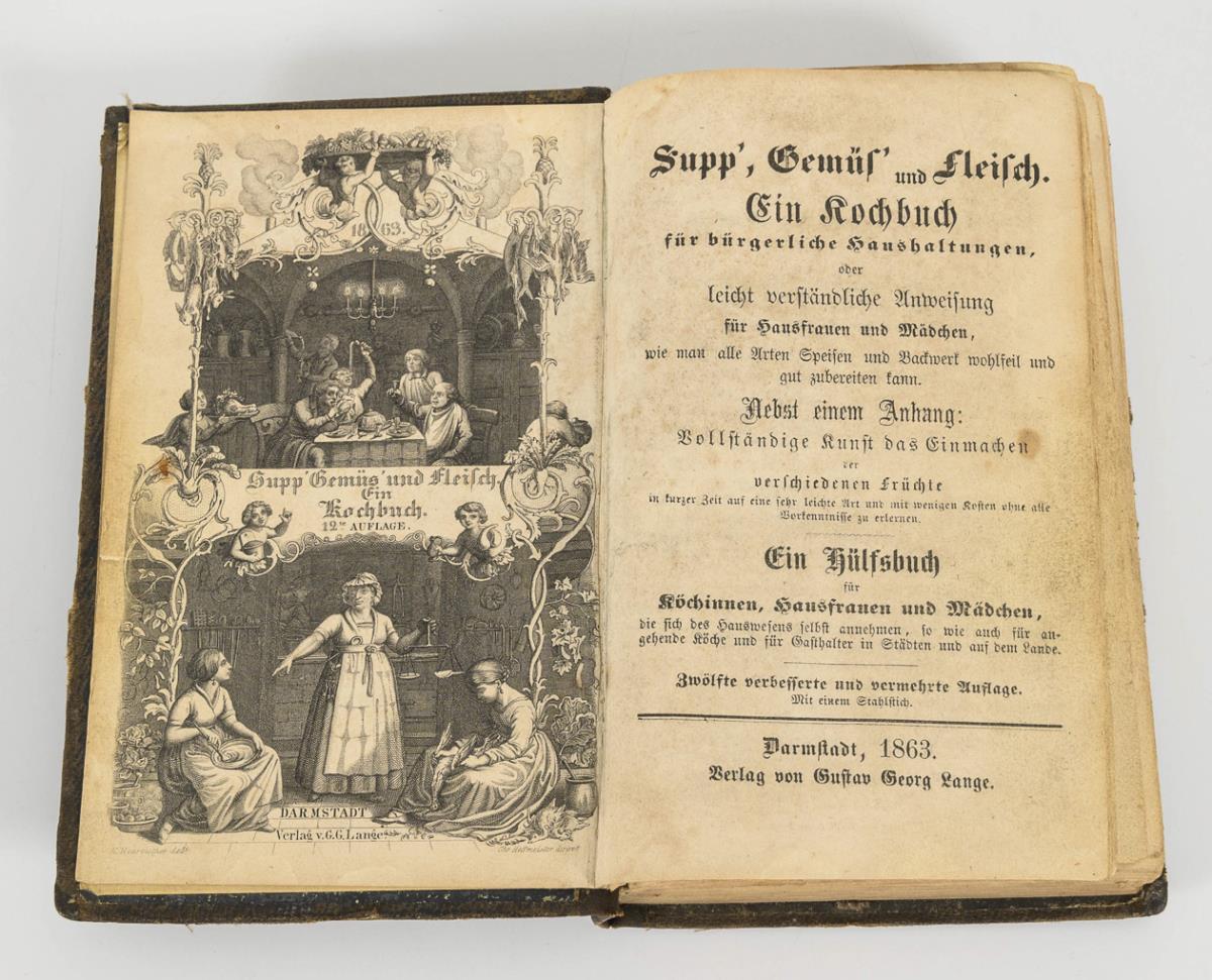 Handwritten book from 1790 with recipes, but also with household tips, bound in brochure with a more recent cover. On this metal embossed, florally designed sign "Pamietnik". Approx. 23.5 x 18 cm. / "Supp', Gemüs' und Fleisch. Ein Kochbuch für bürgerliche Haushaltungen", "...nebst einem Anhang: Vollständige Kunst das Einmachen der verschiedenen Früchte...", Darmstadt 1863, 12th improved and enlarged edition, published by Gustav Georg Lange, 24 and 398 pages. 17.5 x 11 cm.