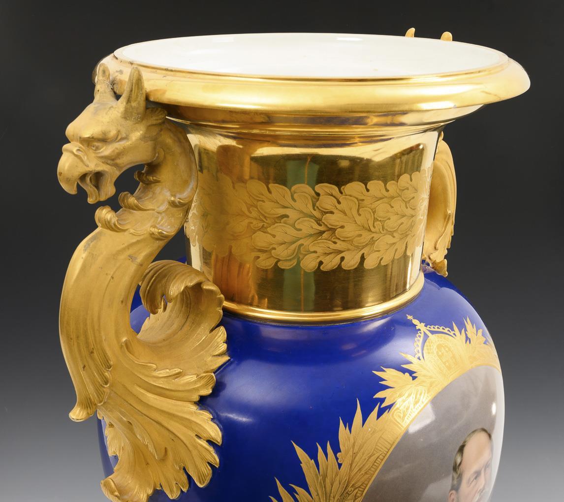 So-called "French vase". Ovoid body with two gold-bronzed griffin handles, cylindrical neck with crater mouth, round foot and square plinth. Royal blue ground, on both sides a medallion framed by a gold-engraved laurel wreath with German imperial crown, inside: 1x the portrait of Emperor Wilhelm I of Prussia (1797-1888) in uniform with numerous decorations. / 1x the view of the palace of Prince and later Emperor Wilhelm I of Prussia, the so-called " Old Palace" under the Linden in Berlin, after a steel engraving by Albert Henry Payne (1812-1902) and a drawing by Alexander Carse (1770-1843). 1 gryphon ear glued, 2 gryphon ears, 2 base corners and body base restored, minimal wear to 1 base edge and mouth rim.