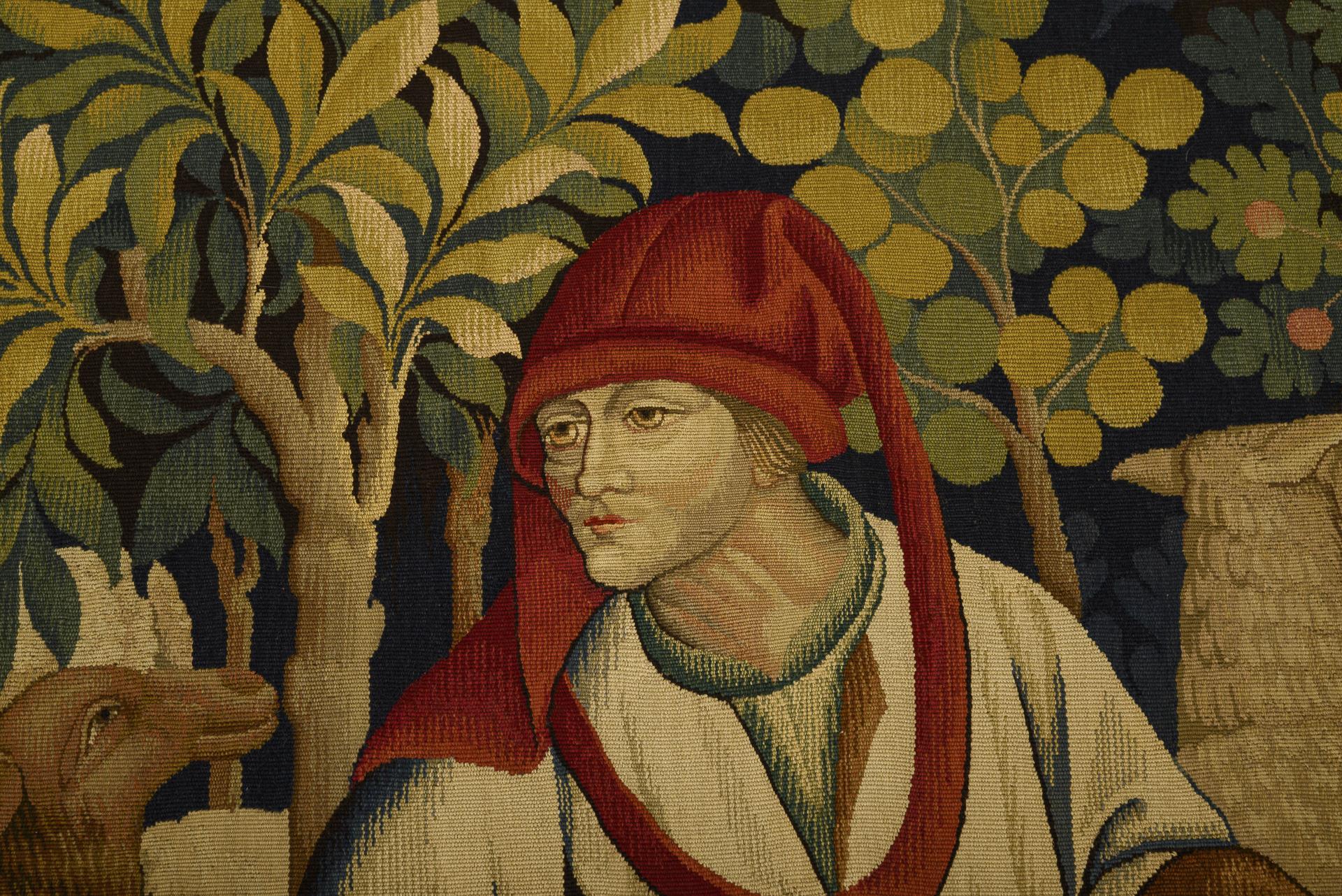 A tapestry in a Flemish style with a historicizing figural scene by a stream in a flowering landscape. 2 shepherds and a shepherdess resting with their animals, sharing the bread and shearing the sheep. Verso &numl;senaufhgung and lead seal Brüssel.