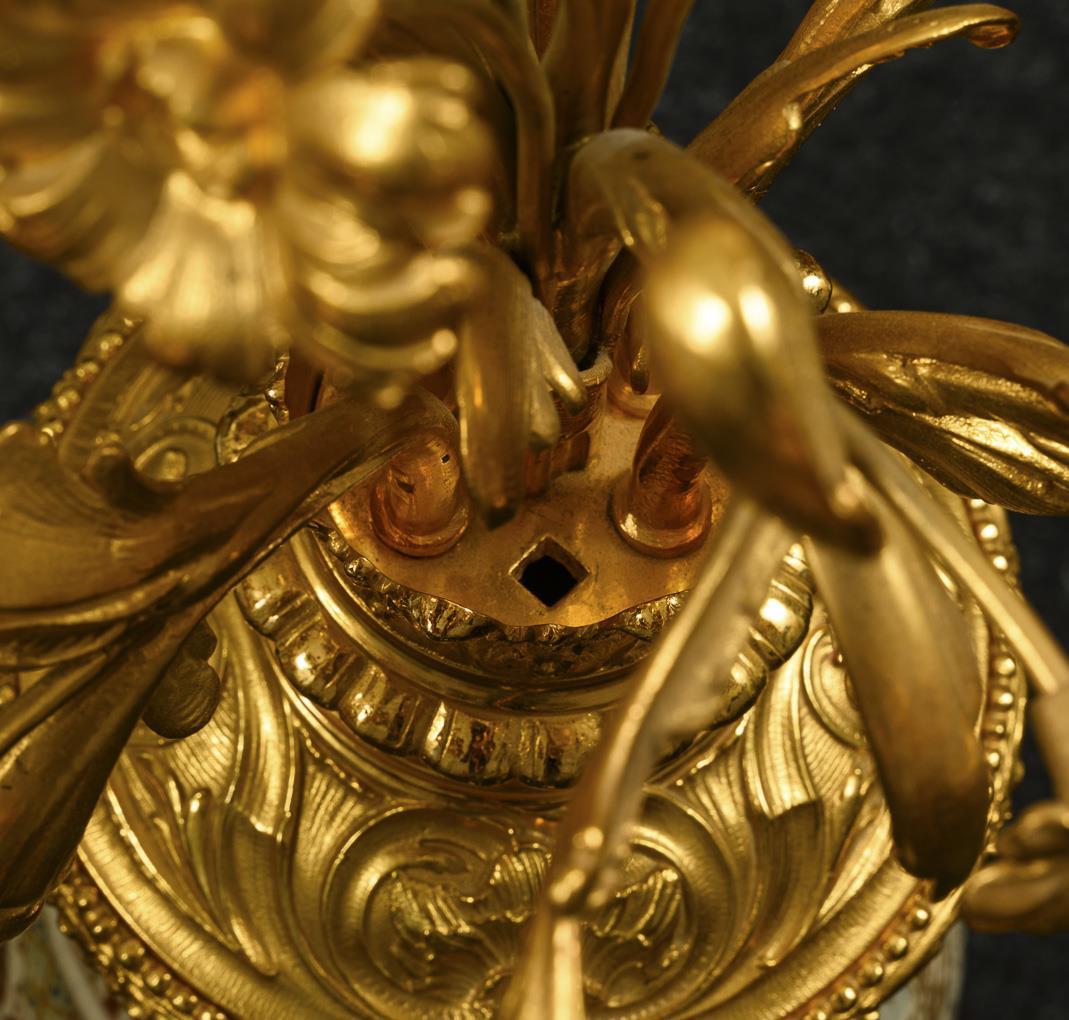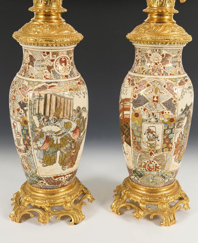 Satsuma vases with French gilt bronze mounts. Two different picture cartouches each with a samurai and a fighting bird figure, as well as a family of sparrows, as humanized figures, in kimono. The candles are distributed irregularly over several tiers. Each candlestick probably has room for another candle arm.