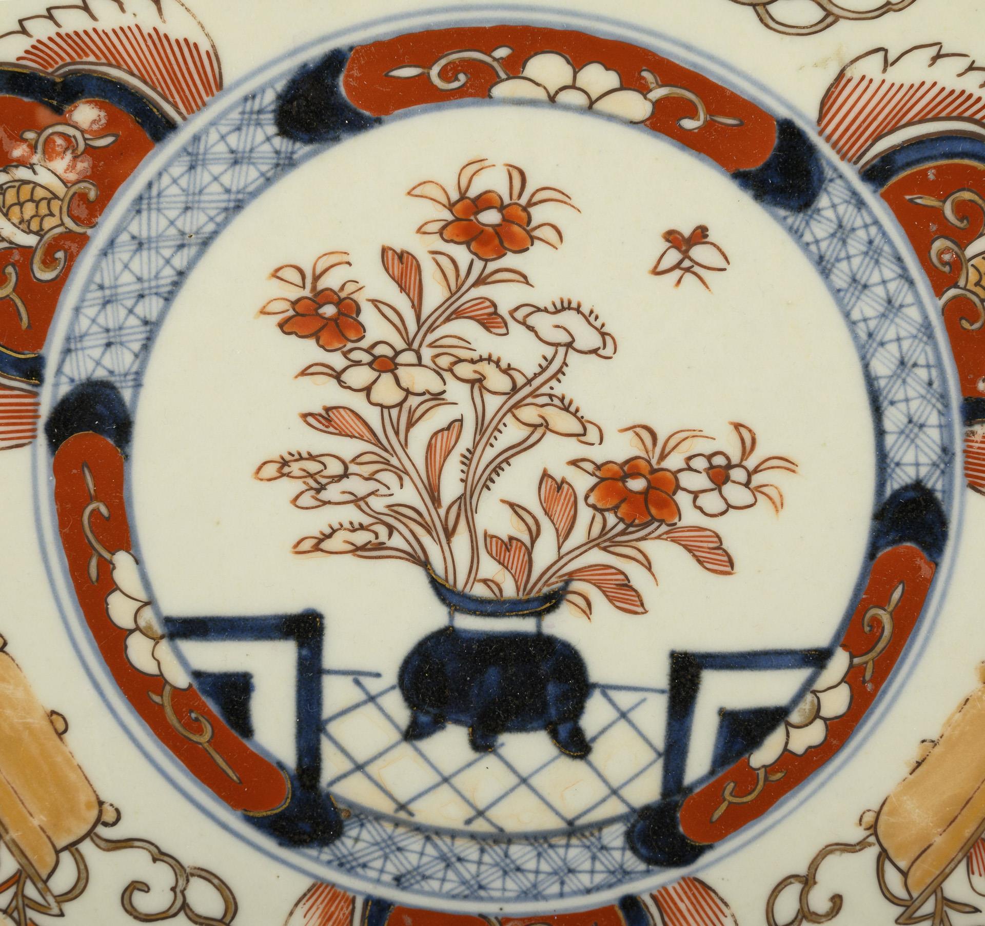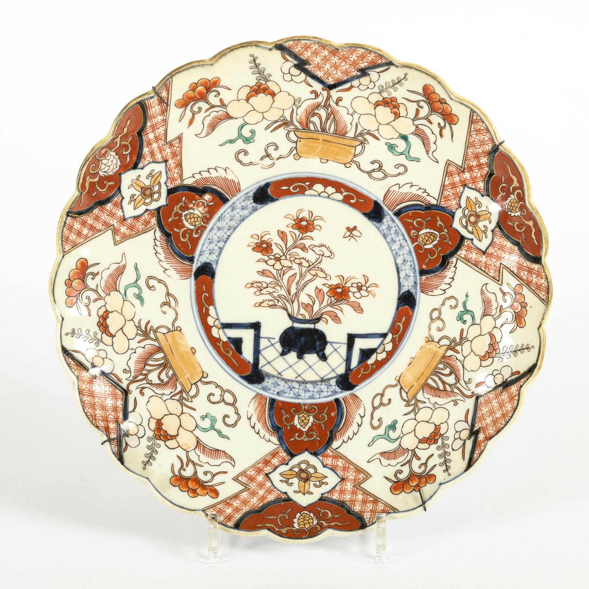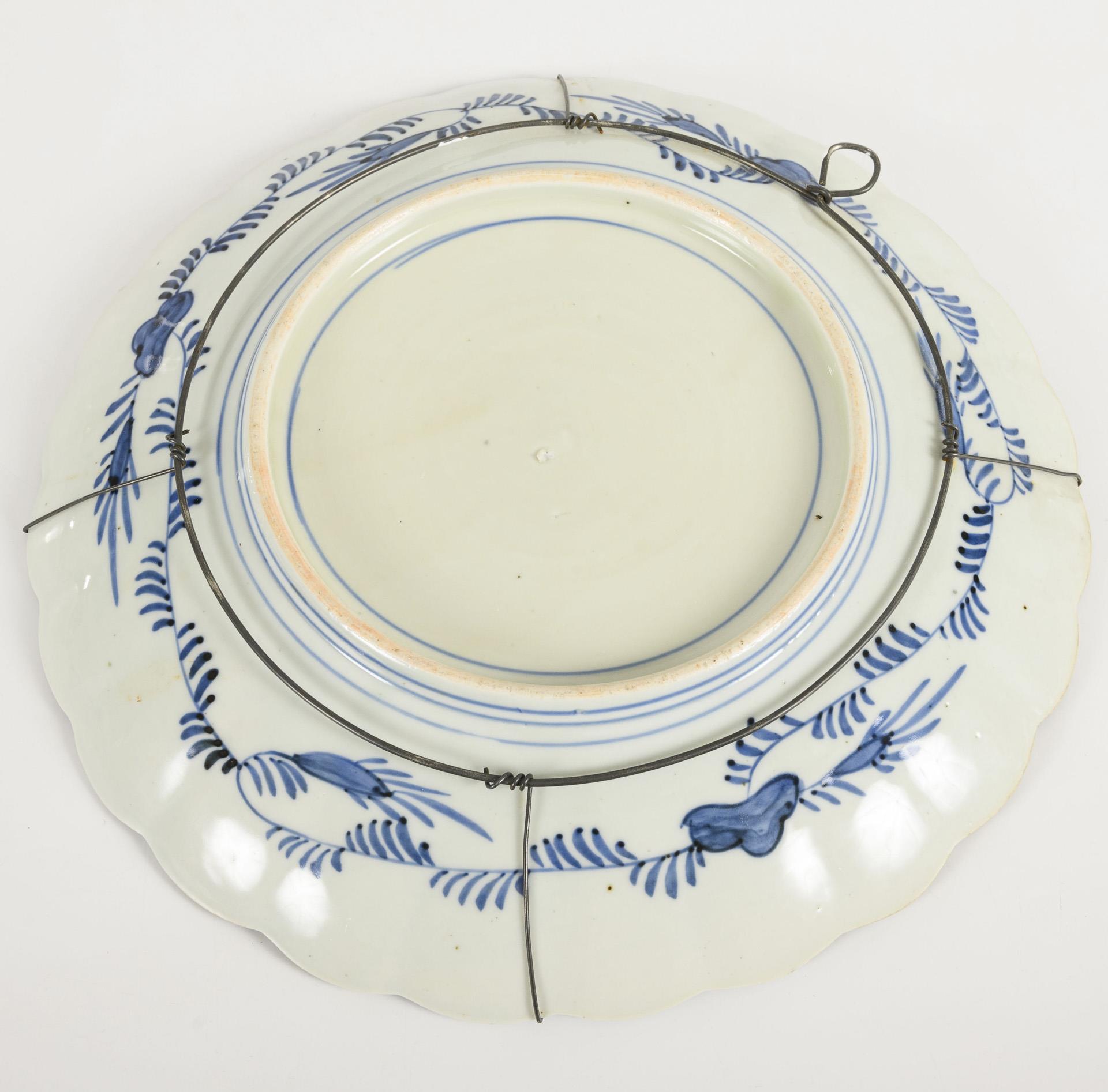 Light decor with a few elements in underglaze blue, a vase piece in the center, wavy rim, underside with surrounding tendril pattern. Paint slightly rubbed.