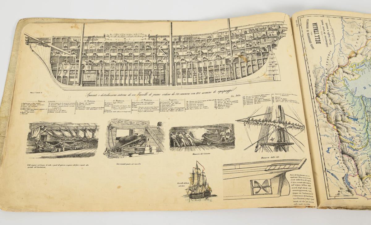 Atlas with descriptions and further explanatory drawings. 19 sheets with illustrations and texts. Marked signs of wear.
