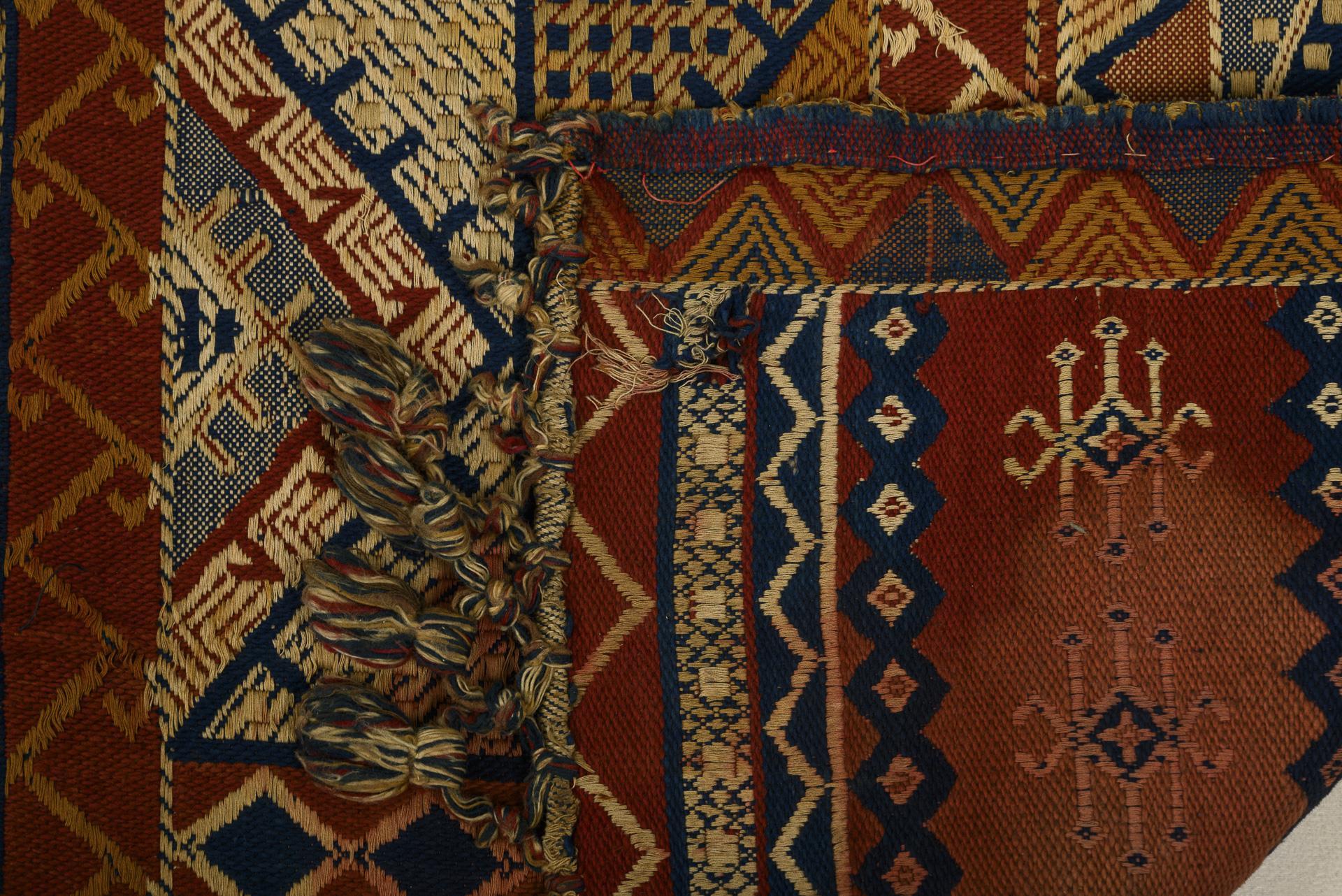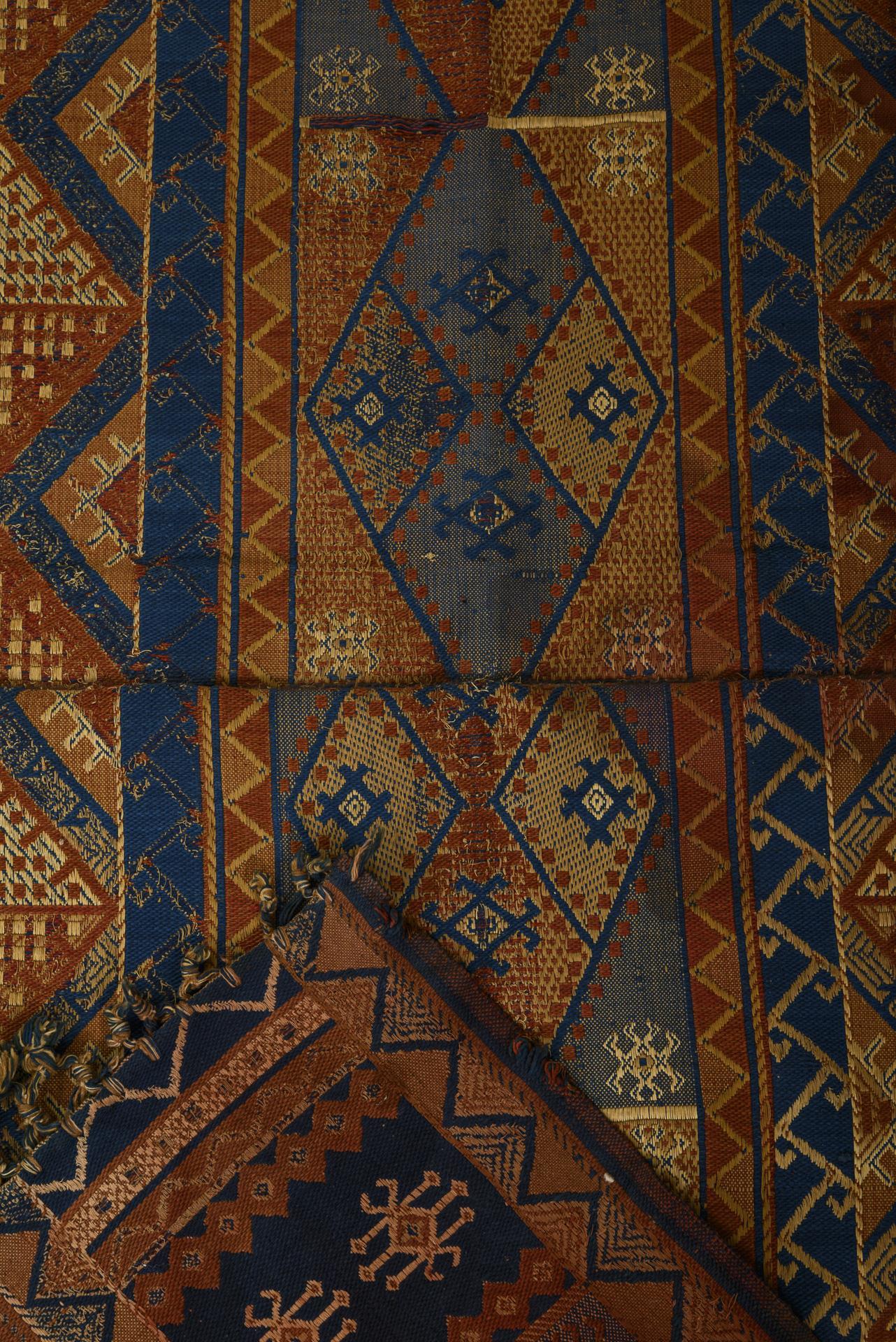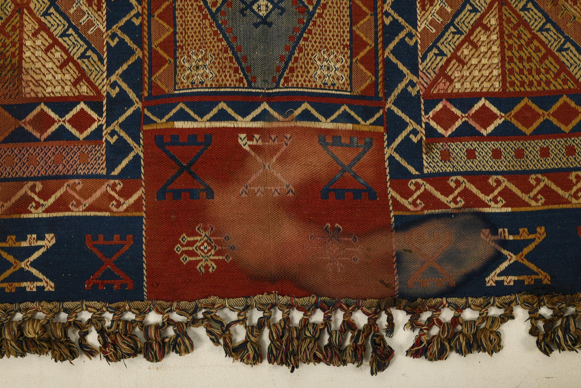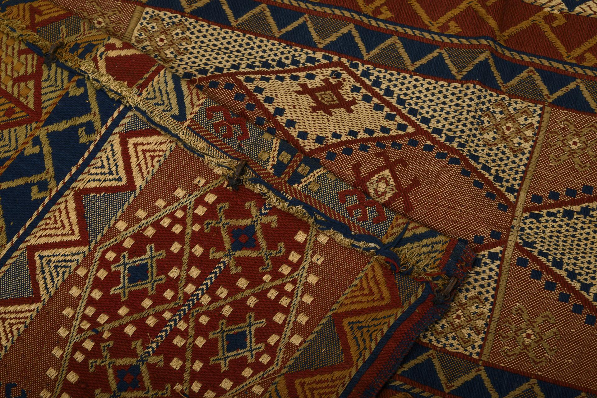 3 carpet fragments with diamond-patterned striped bands. Each fragment with a final narrow side with knotted fringes. 2 striped kilims sewn together in the center and with hooked edging, 1 kilim with hooked edging on the reverse on the narrow side. Signs of age, defects, some water damage, long edges partly sewn over, repairs.