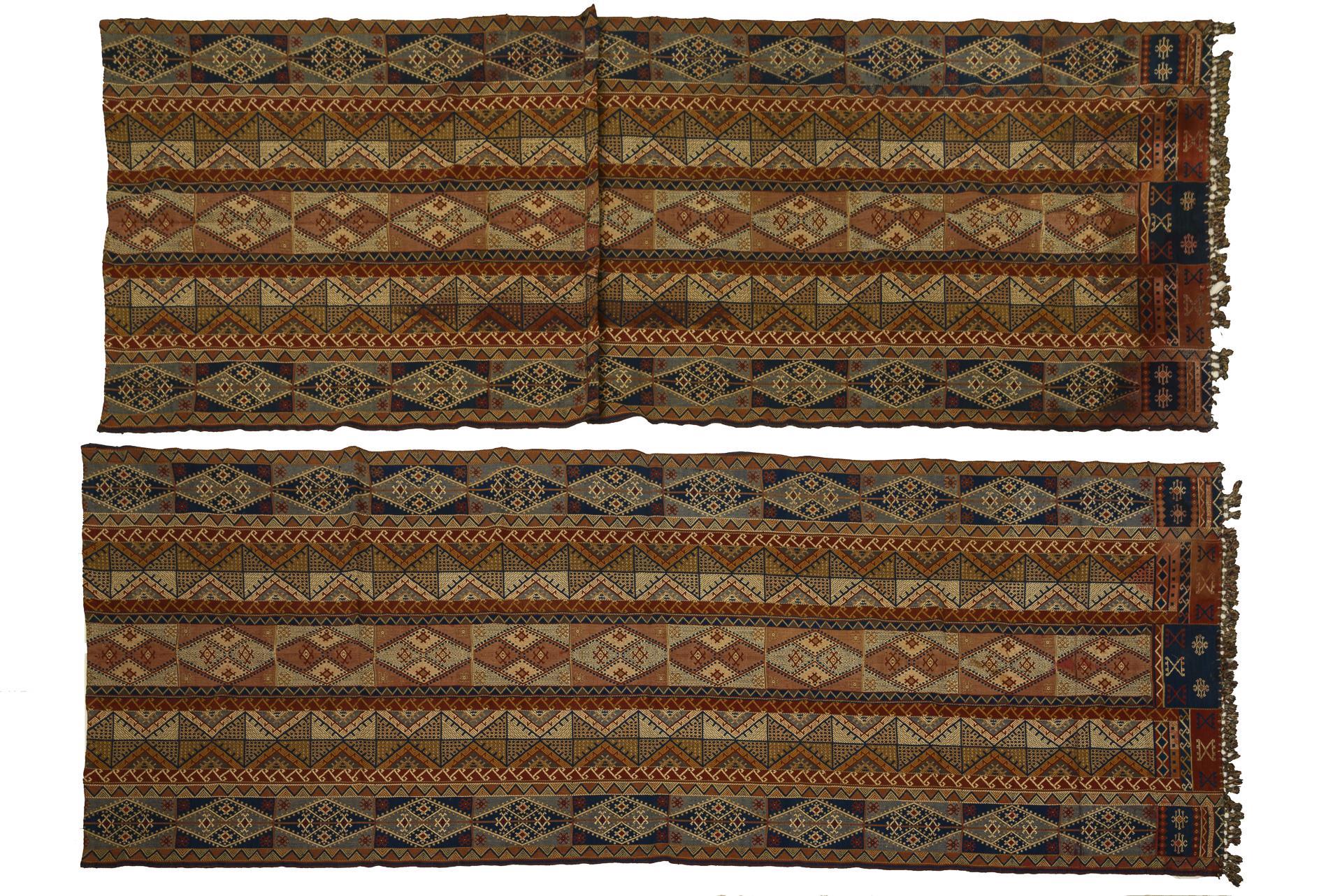 A flat weave composed of individual strips of fabric in kilim technique, wool dyed in natural colors. Approx. 120 x 328 cm, 119 x 324 cm, 122 x 340 cm.