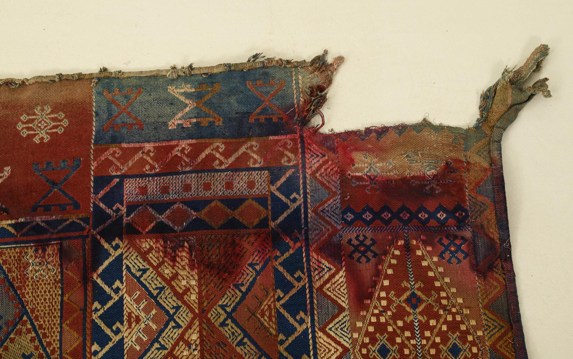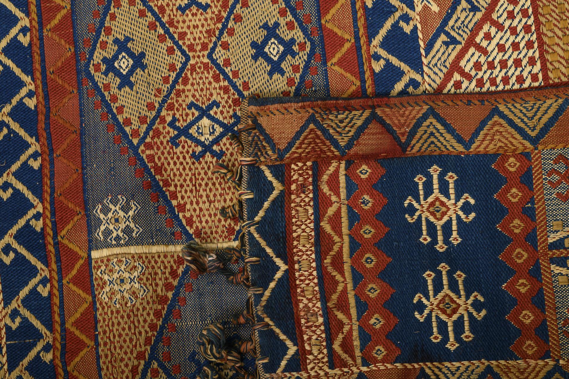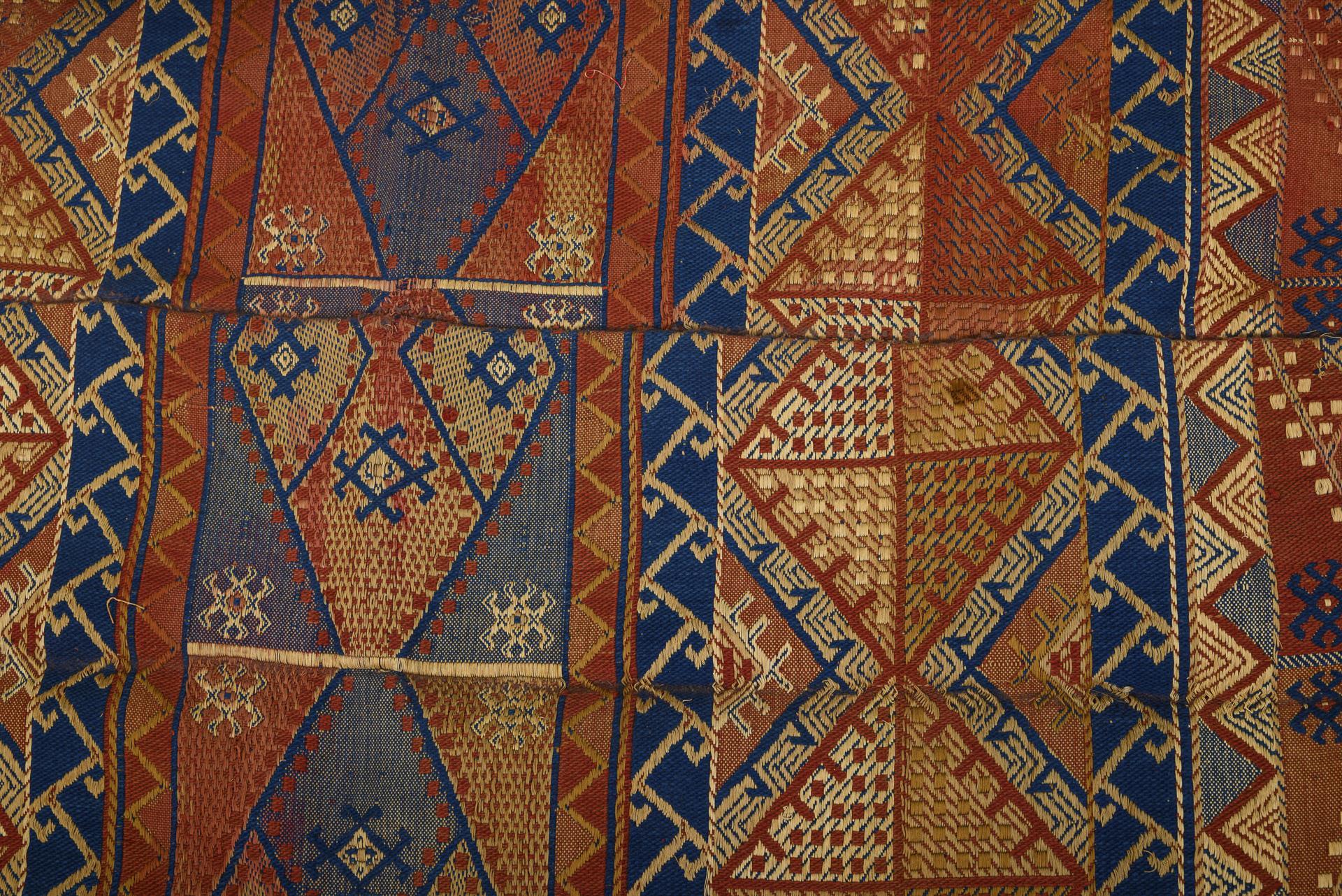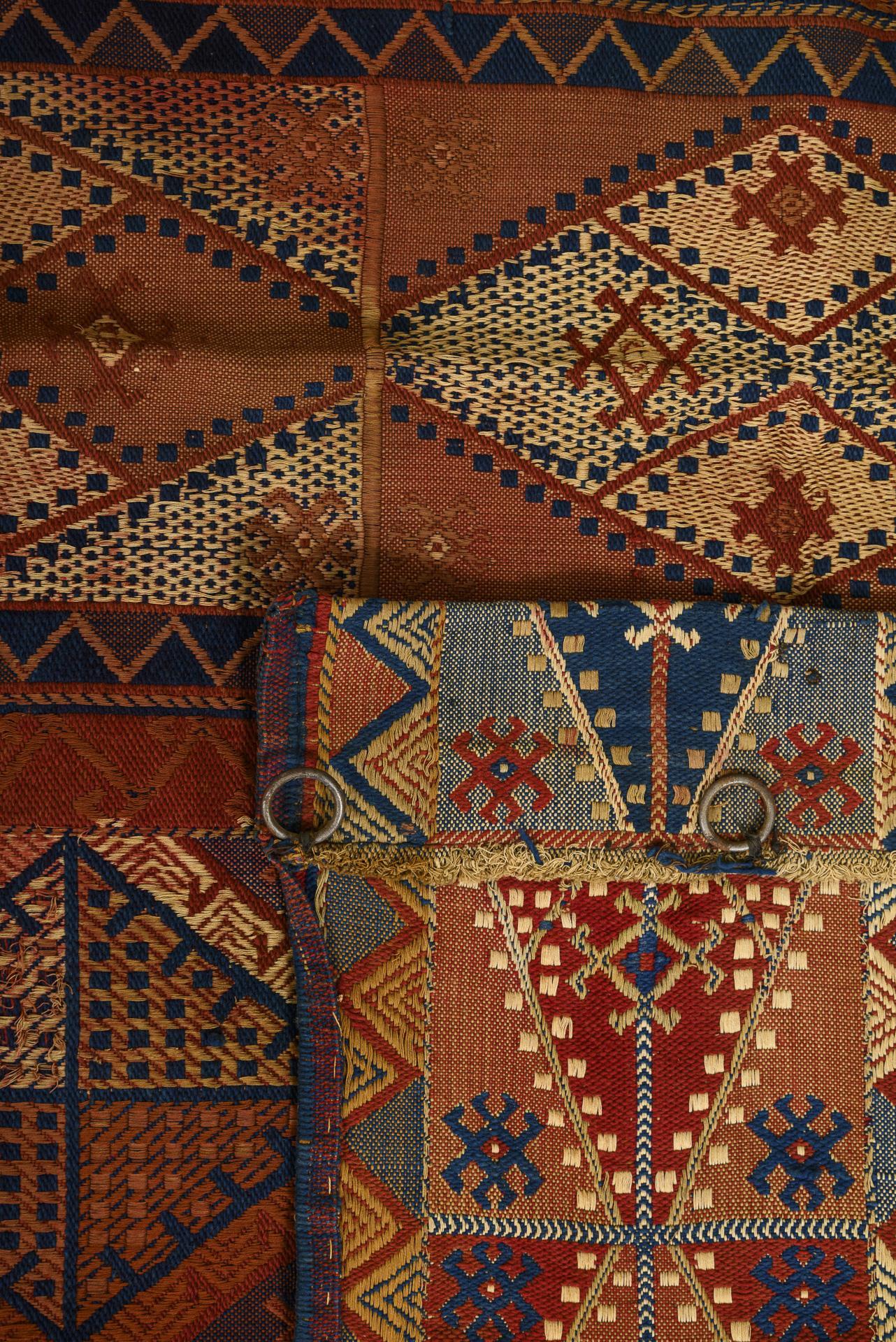 3 carpet fragments with diamond-patterned striped bands. 2 fragments with a final narrow side with knotted fringes. 2 striped kilims sewn together in the center and with hooked edging, small kilim sewn on 3 sides and with round eyelets. Signs of age, defects, some water damage, long edges partly sewn over, repairs.