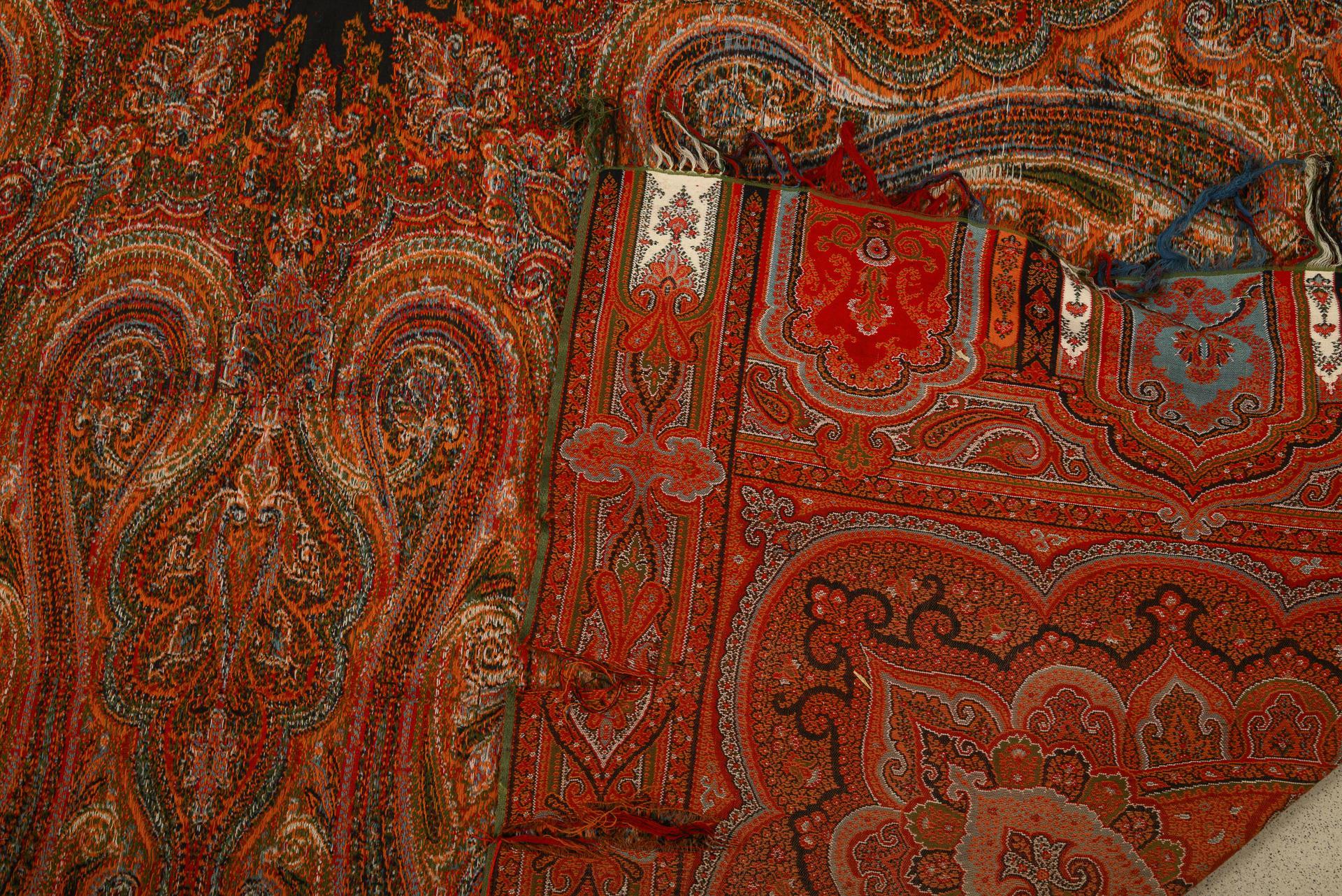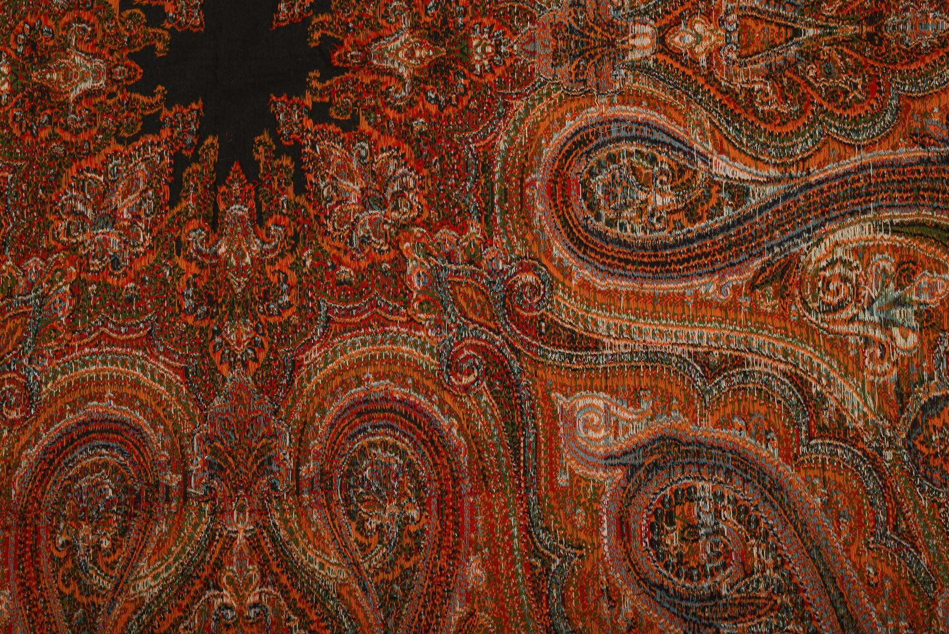 Square shawl with a central star medallion, surrounded by large palmettes and botehs. Narrow border with niche architecture and pointed arch cartouches. Rim defects.