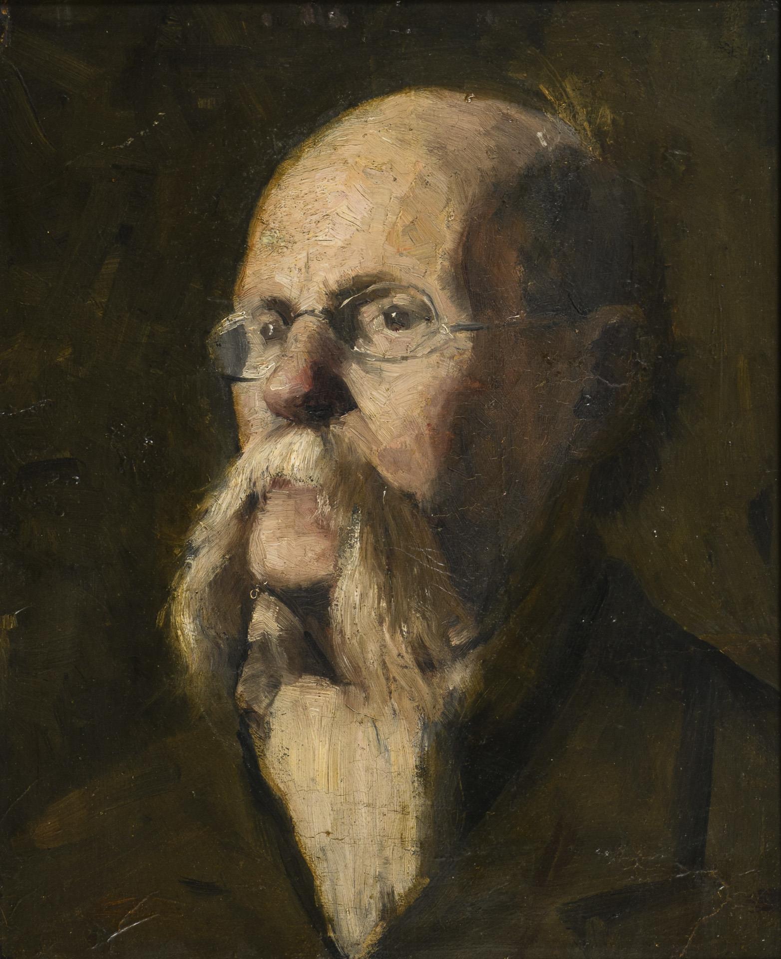 Portrait of an older man with glasses and beard against a neutral background and profile portrait of a man in a dark suit. Each with traces of age.