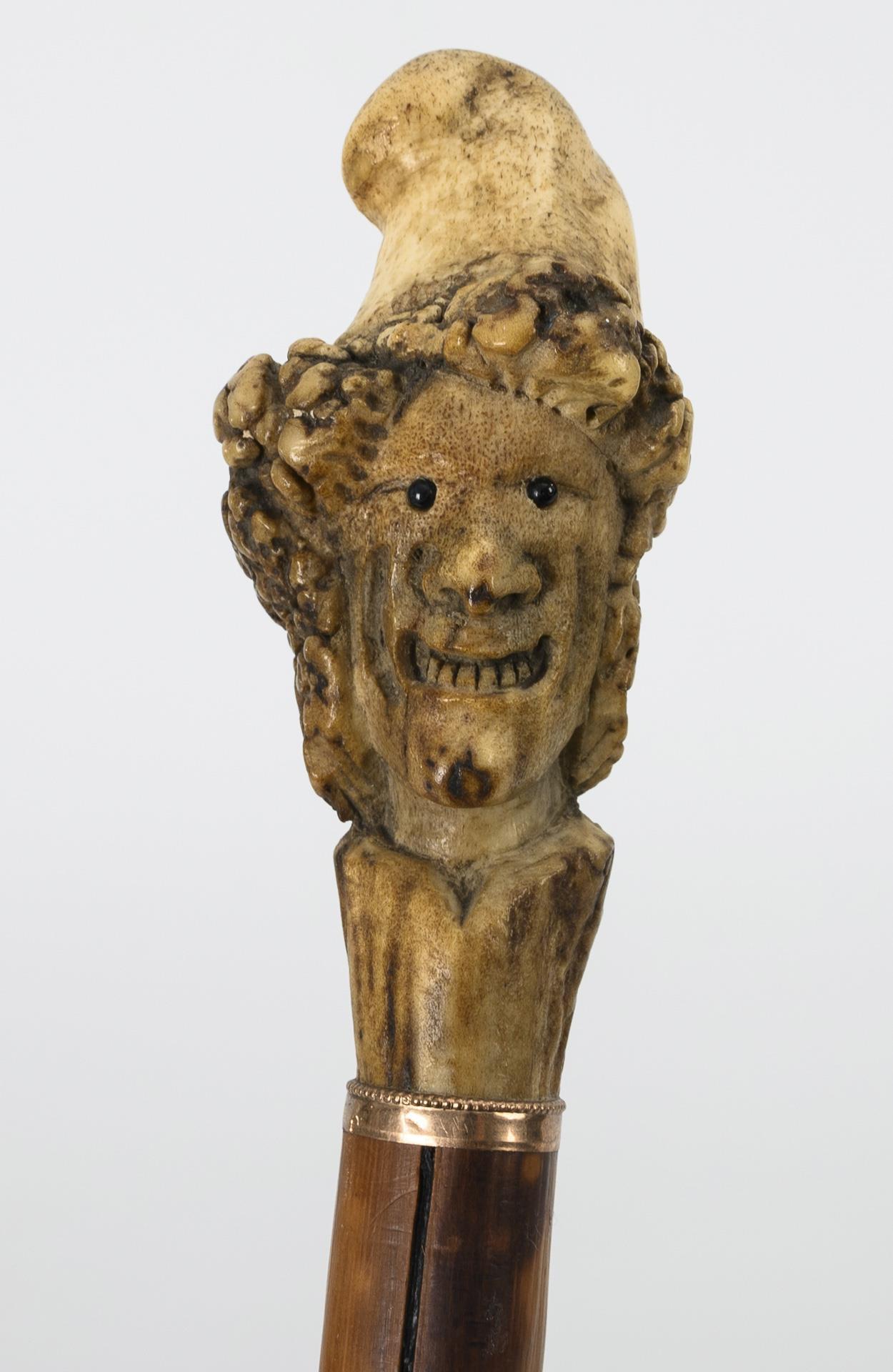 Laughing caricature head with jabobin cap and glass eyes, probably gilded small cuff, medlar shot with brass eyelet at the hole for the (missing) lanyard and copper ferrule. Dry cracks to the wood, slight signs of age/use to the head.