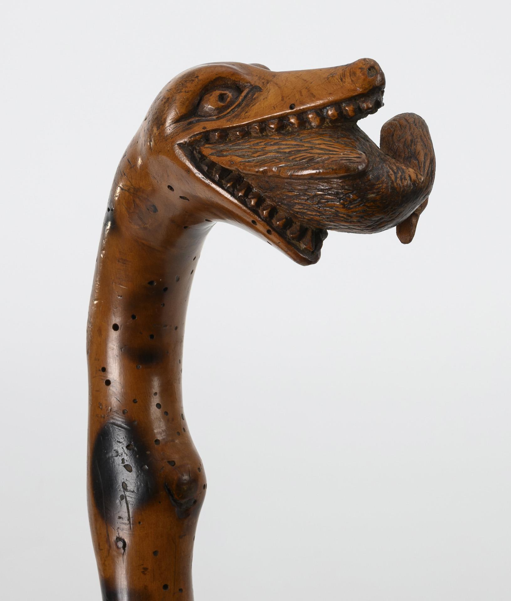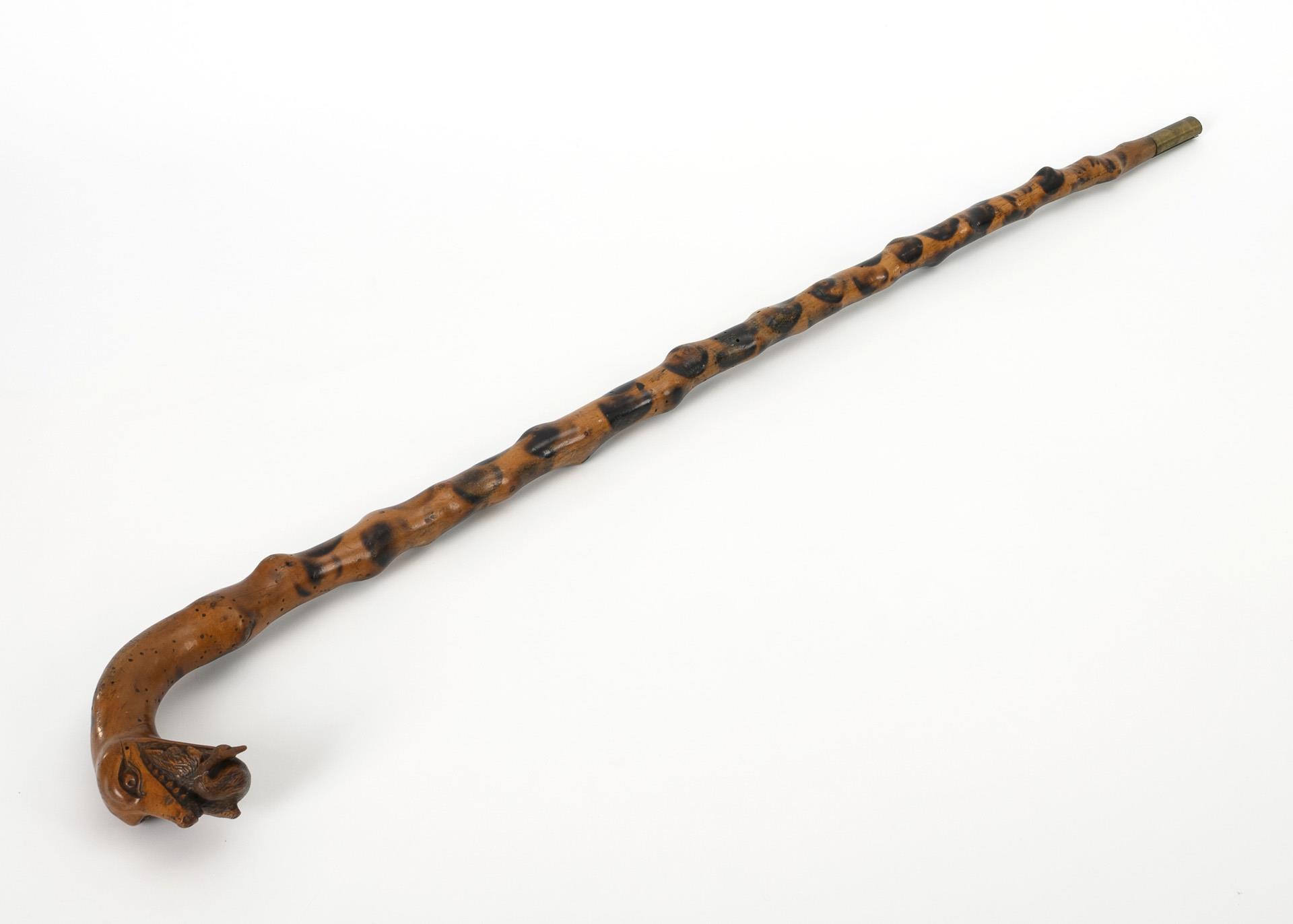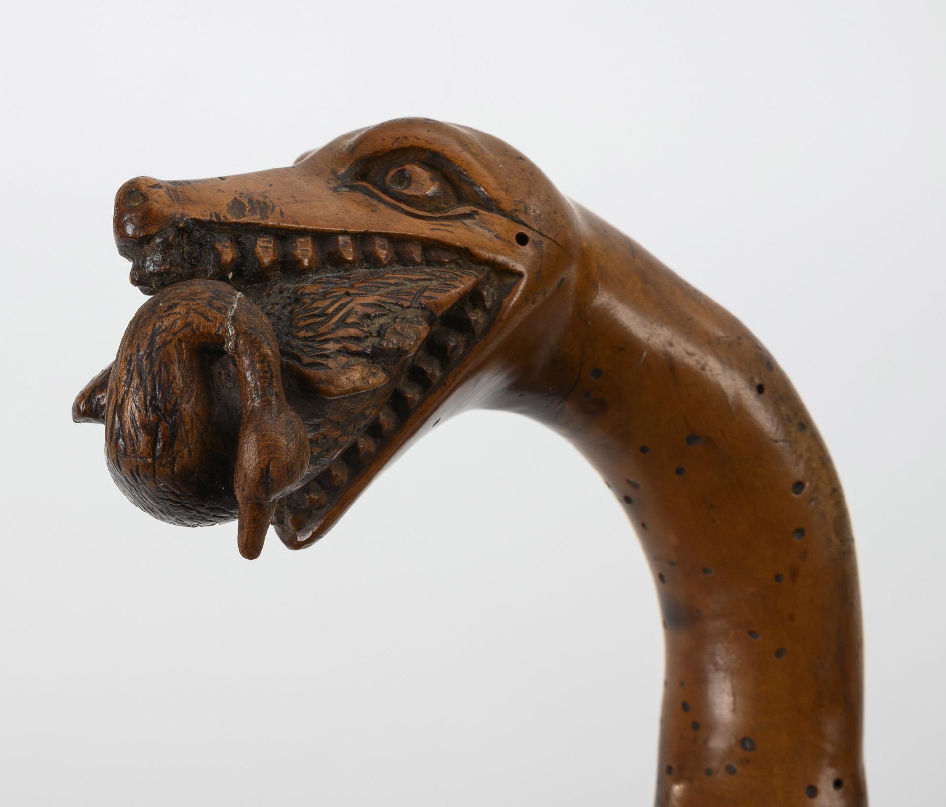 Walking stick made from a single piece of wood with a pommel in the shape of a dragon-like head devouring a goose. Shot worked as a knotted stick with fire shading and long brass ferrule. Swan neck glued, traces of use, small dry crack on the ferrule, some signs of age/use.