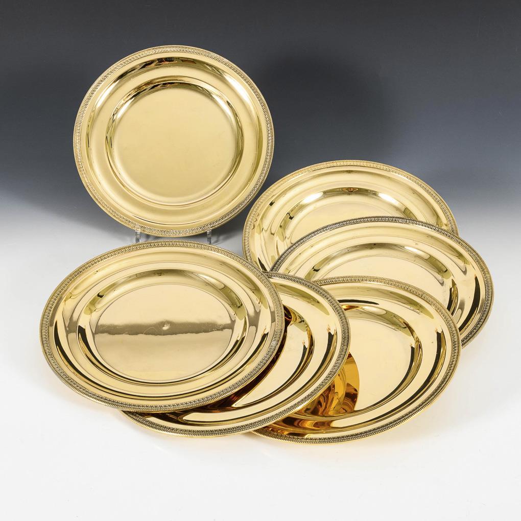 Flat, round plates with finely reliefed tongue band. Signs of wear, scratches, 1 plate with small dent.
