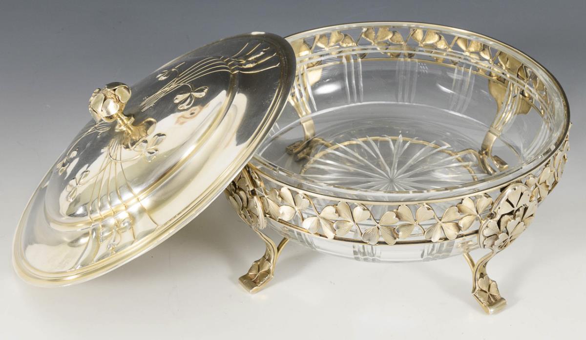 Clear glass, silver. H 14 cm, Ø 21 cm, tray: 30 x 34 cm. Together 1585 g (without insert).