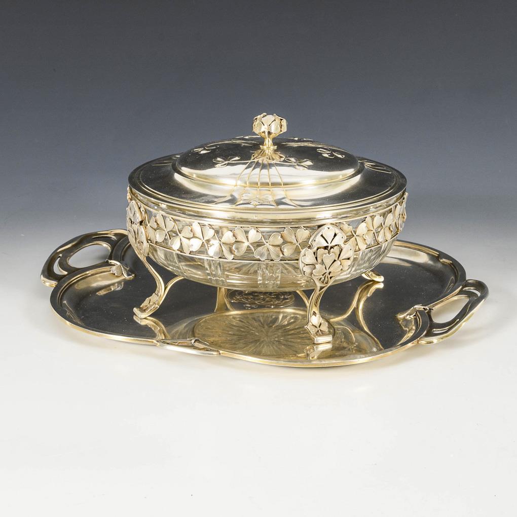 High-quality French Art Nouveau tureen on tray. Alphonse Debain, Paris.