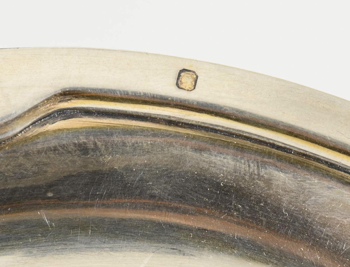 Partially gilded, decorated with trefoil motifs. Lid and tray minimally dented.