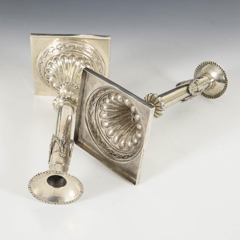 Elegant, single-flame candlesticks with column shaft, applied garlands and square plinth. Signs of use, small soldered areas.