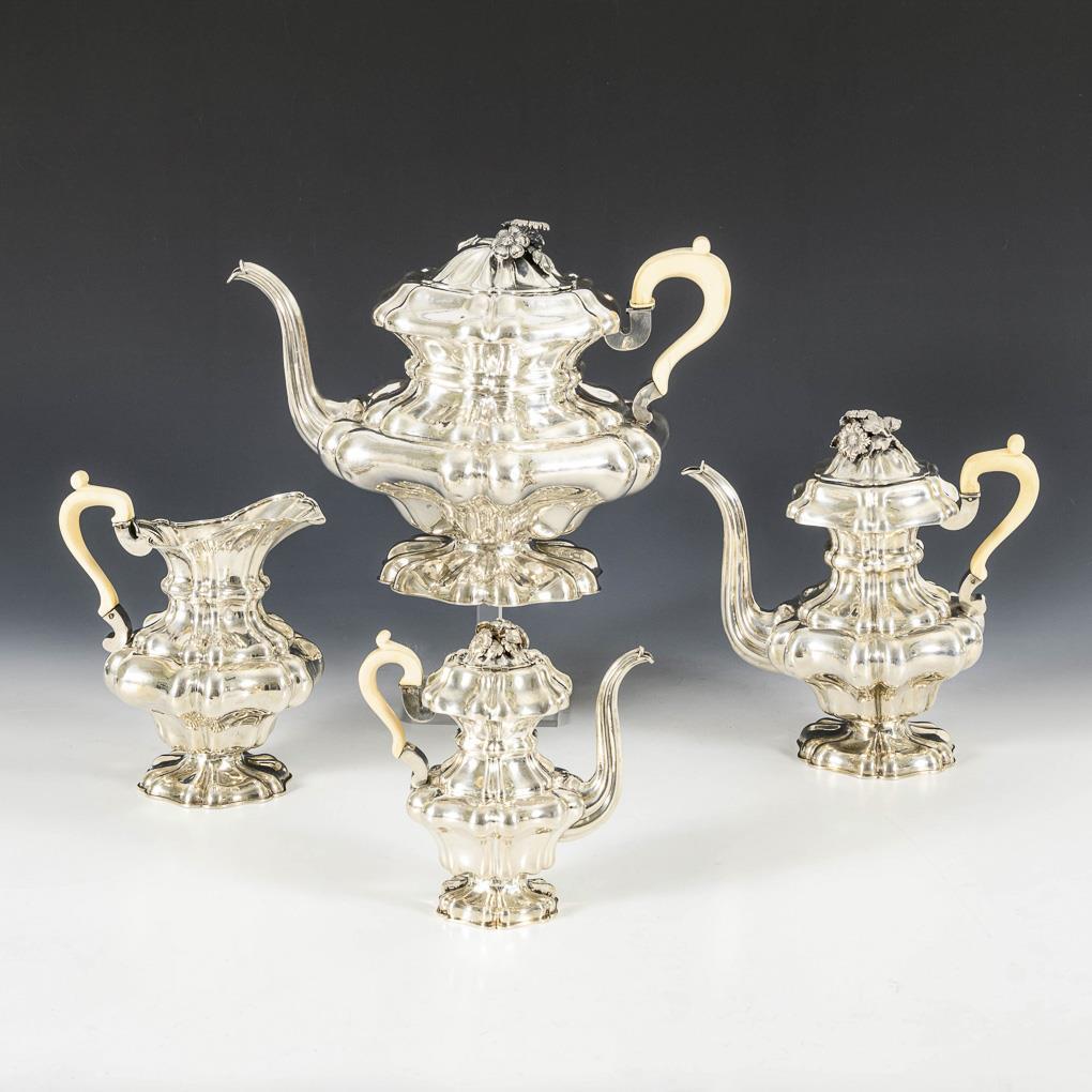 Crowded baluster shape with ivory handles and sculpted floral finials: large teapot, as well as coffee, mocha and water jug. Some dents and repairs. Handles with fine dry cracks, 1x glued.