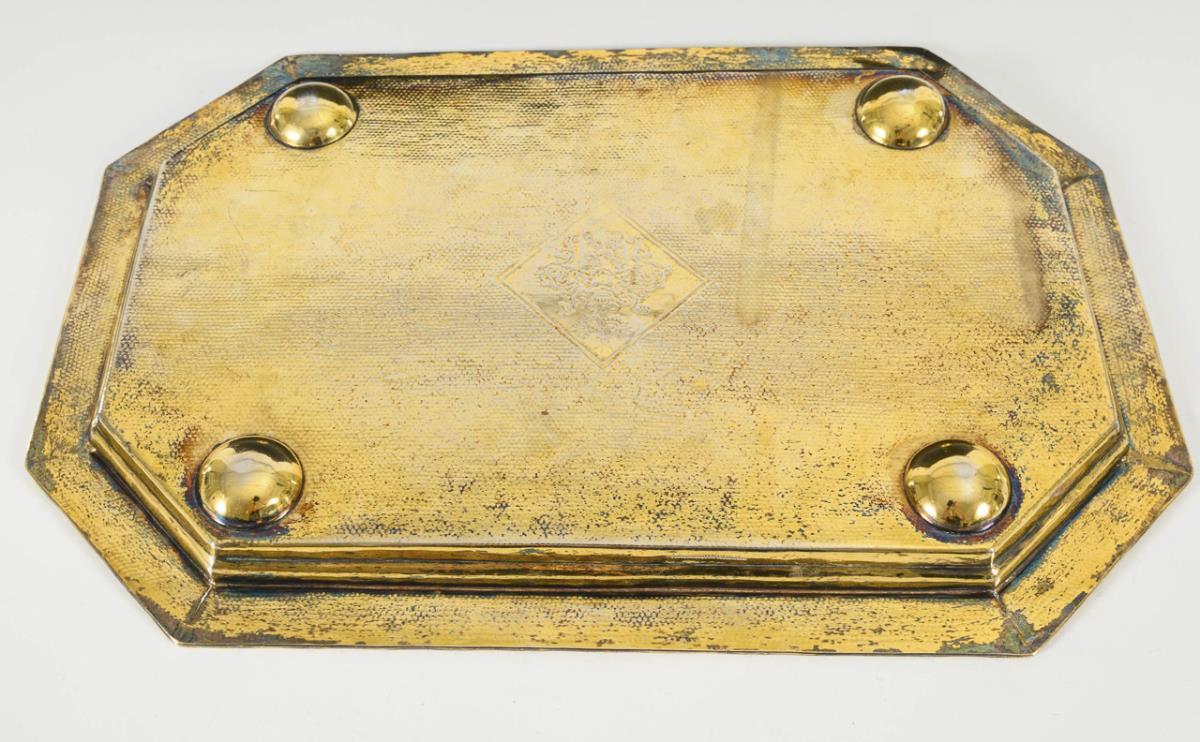 8-sided tray with hammered surface, engraved coat of arms in the mirror and surrounding bamboo stick on the rim. On flat feet. Some dents, feet compressed, gilding somewhat rubbed. One corner with edge crack.