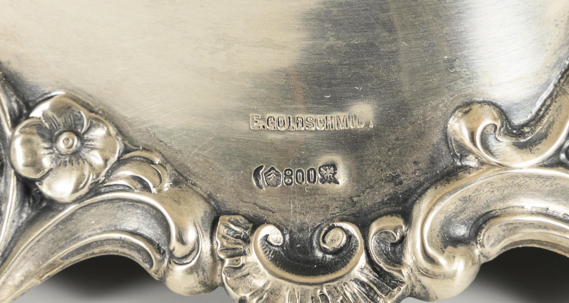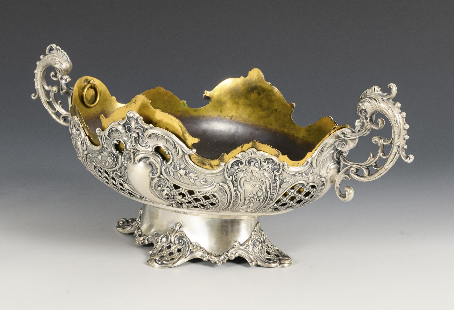 Rococo-style oval bowl with rocailles and decorative openings (752 g). With brass insert. Dented, insert with signs of wear.