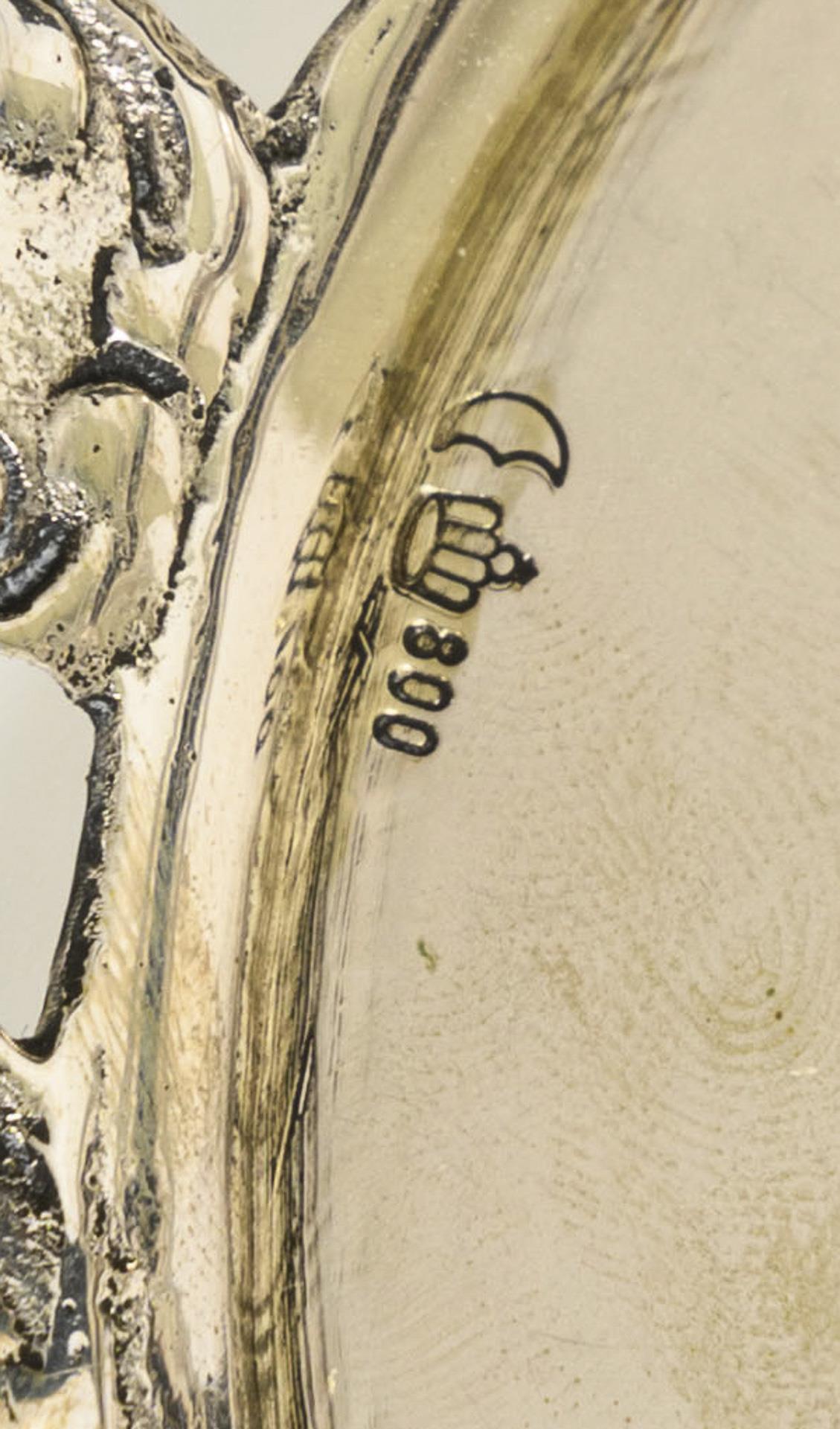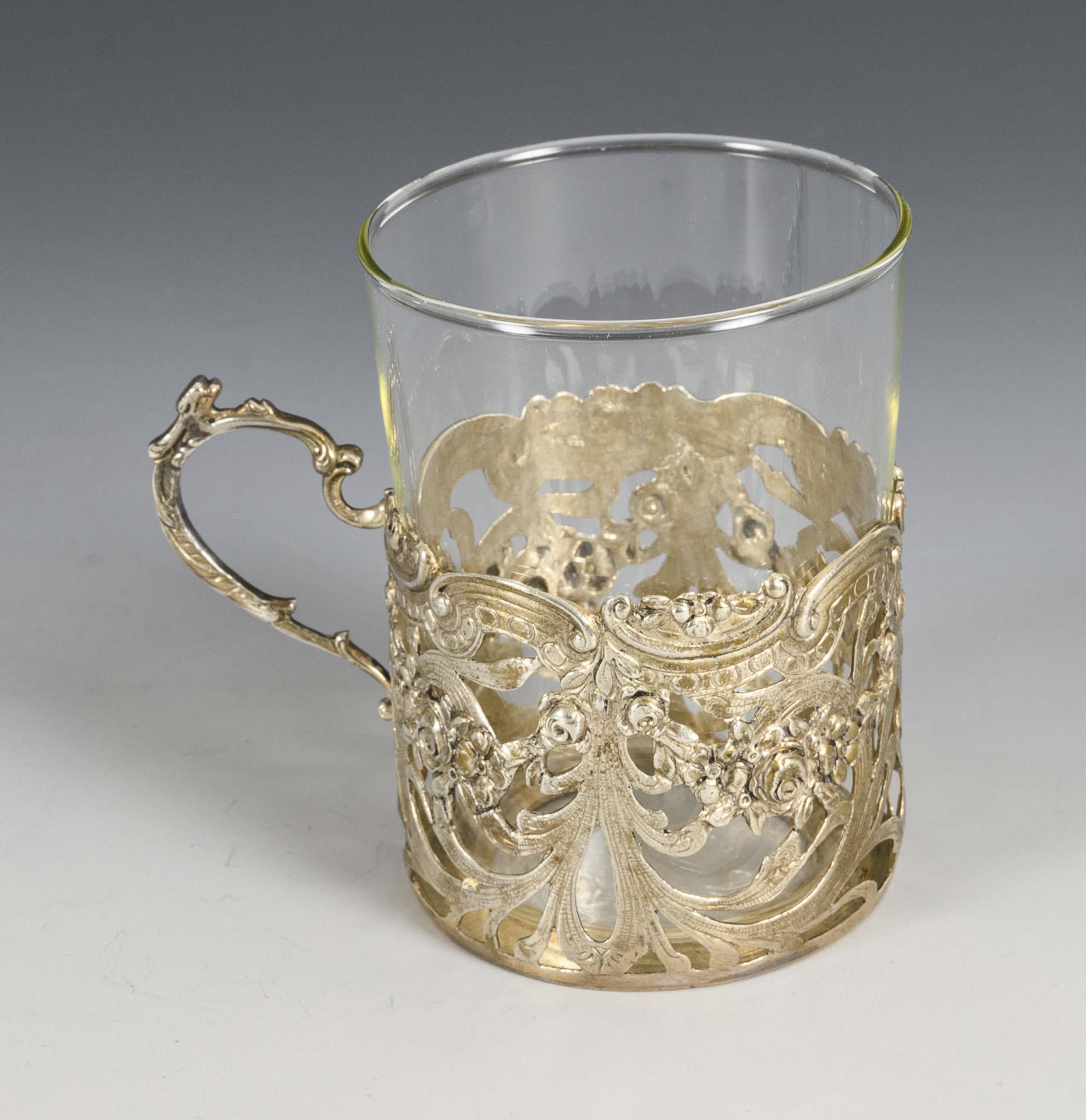 Relief and open-worked glass holders with matching coasters (878 g) and plain glass inserts by Schott. Minimal scratches on the base, handle attachments partly with traces of soldering.
