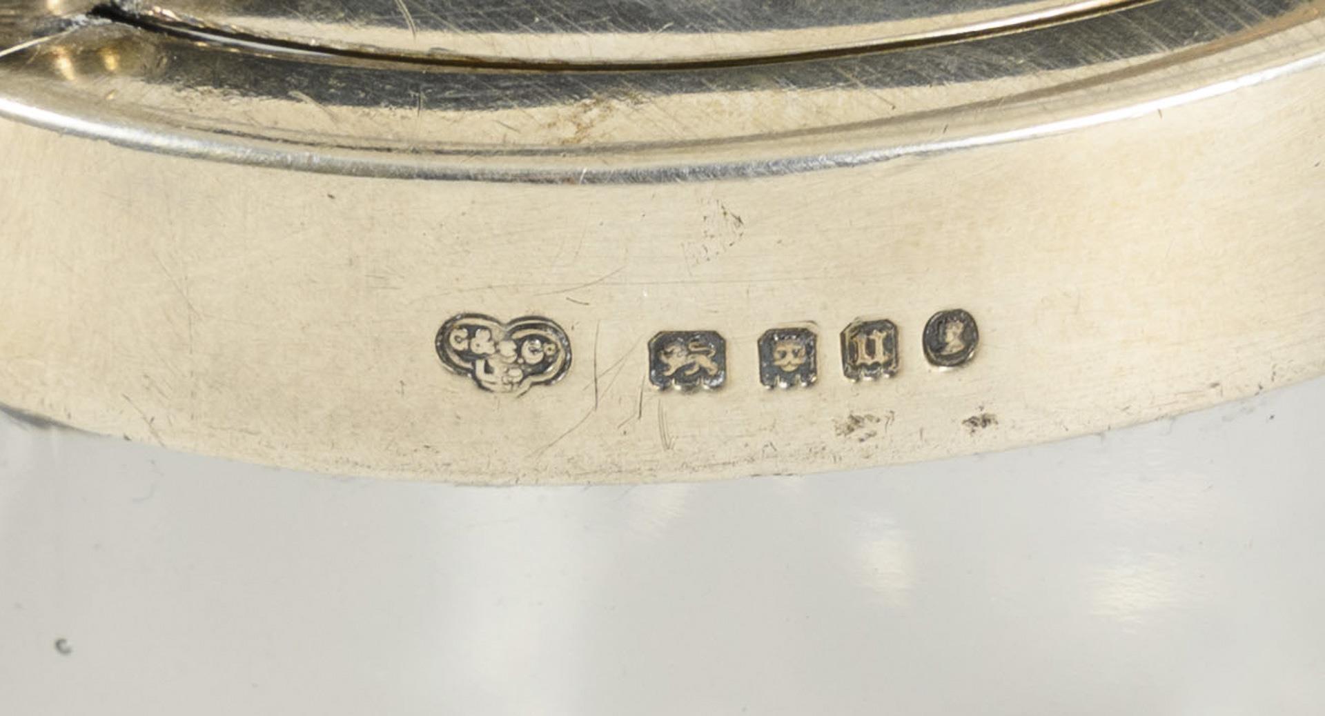English jam jar with silver mount (the lid opens and closes by moving the handle, h 12 cm). / Oval bowl with relief rim, on 4 paw feet (4 x 12 x 9 cm, 77 g). Signs of use, glass with 1 burst air bubble.
